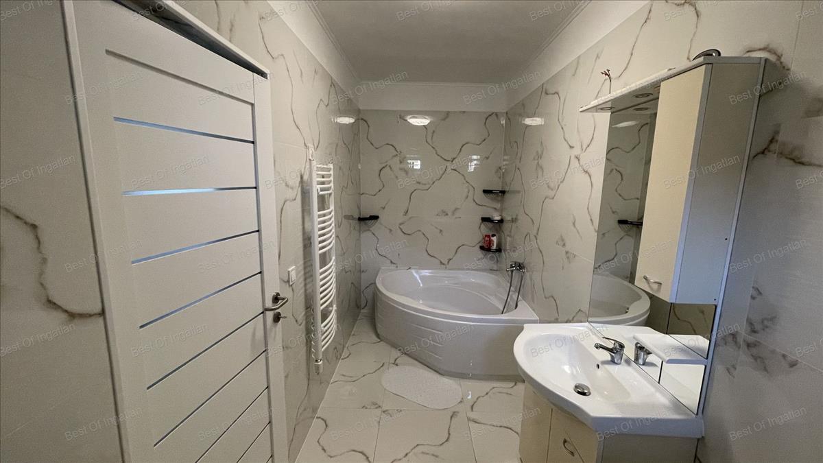 - újszerű igényes fürdőszoba sarokkáddal, mosdóval és WC-vel, törölközőszárítóval felszerlve