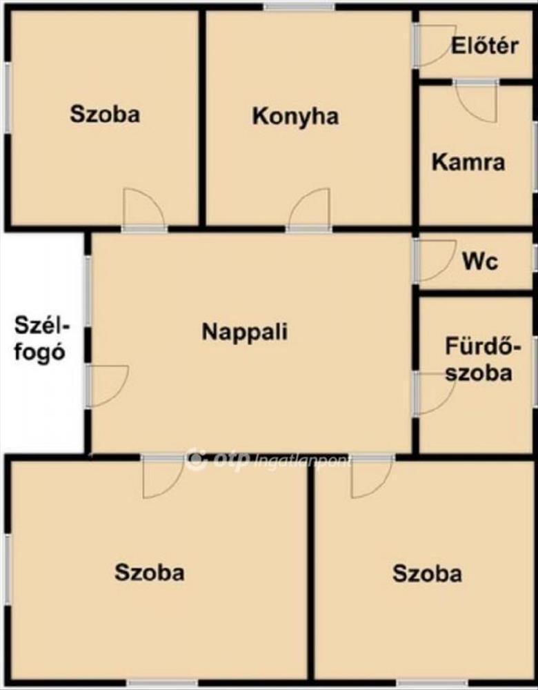 Helyiségei: nappali, 3 külön-nyíló szoba, konyha, fürdőszoba, wc és kamra.