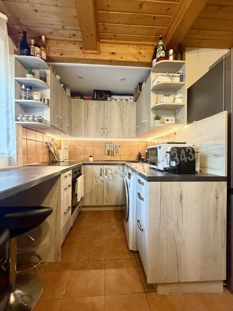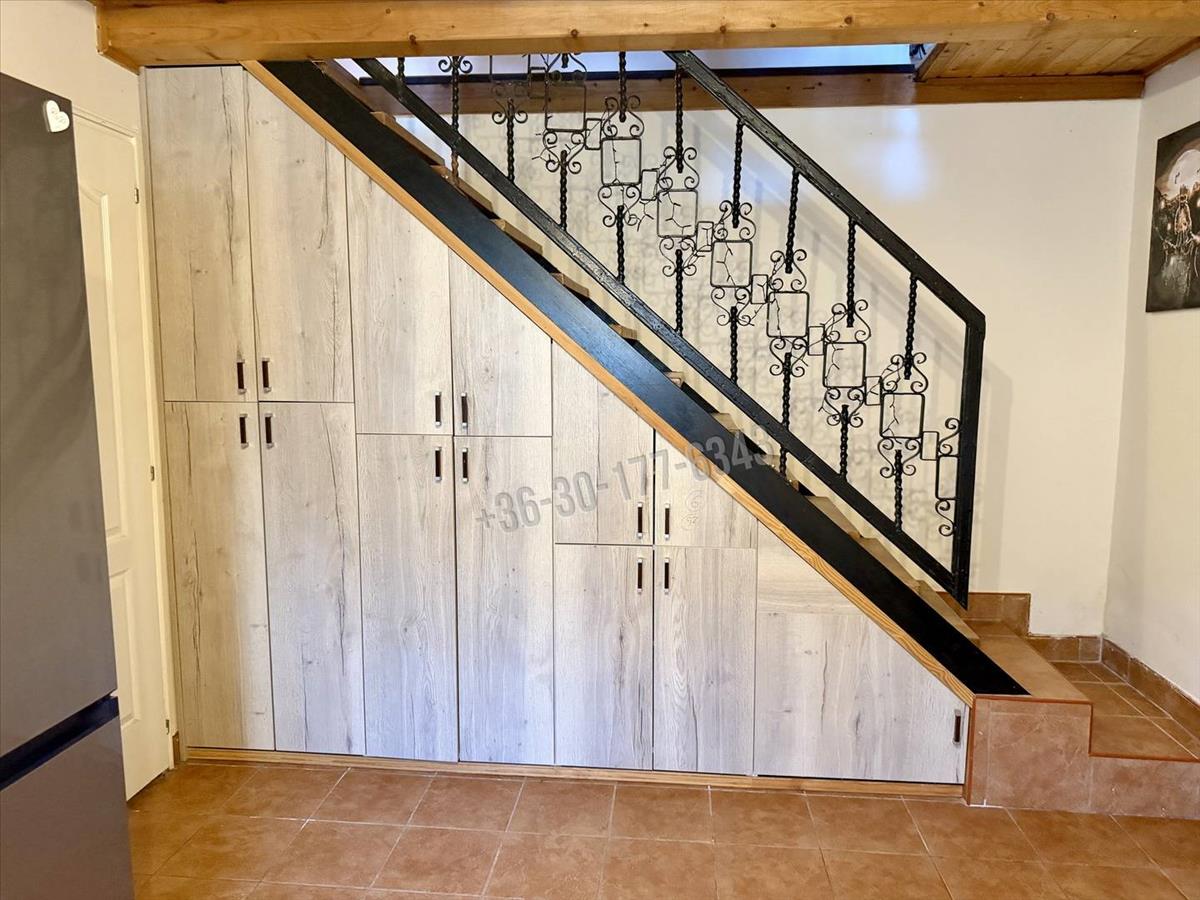 A belső terek otthonos hangulatúak és praktikusan kialakítottak: a földszinten nappali, konyha és fürdőszoba, valamint a lépcső alatti beépített tároló kapott helyet. Az emeleten hálószoba, mosdó és egy kis háztartási helyiség található.