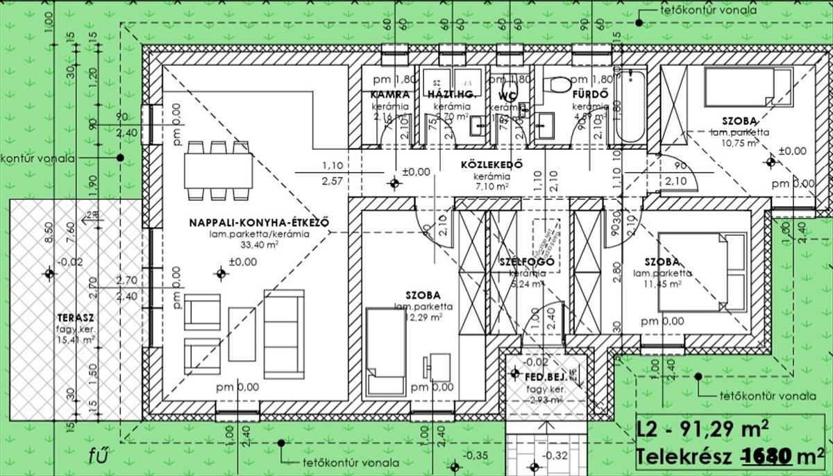 A 91, 29 m2-es ház helyiségei: amerikai konyhás nappali + 3 hálószoba + fürdő+wc + külön wc +háztartási helyiség +kamra +szélfogó +közlekedő
