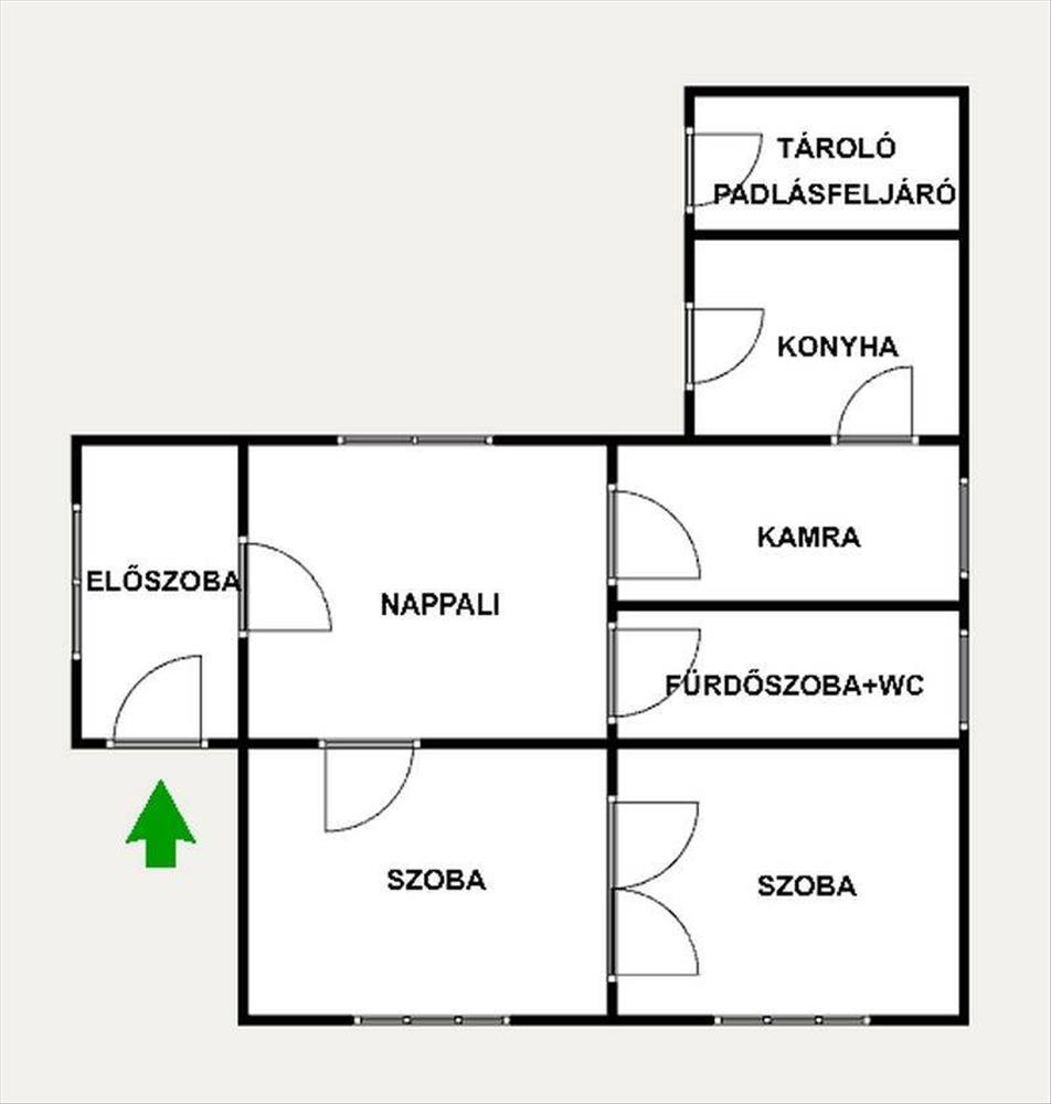 Elosztása: 3 szoba, konyha étkezővel, kamra, fürdőszoba, wc, előszoba, tároló.