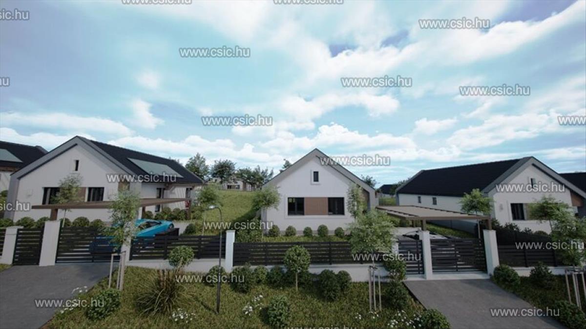 Házak beosztása: 1 tágas amerikai konyhás nappali, külön nyíló 3 hálószoba, kamra/háztartási helység, fürdőszoba WC-vel, vendég wc, előtér, teraszok, kocsibeálló