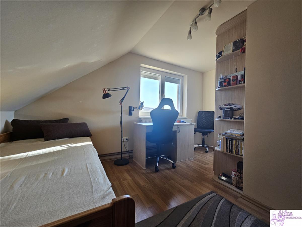 Az emeleti részen közlekedő, dolgozó sarok, 2 gyerekszoba (mindkettő loggia kapcsolatos), egy fürdőszoba, melynek befejezése az új tulajdonosra vár, és padlástér található.