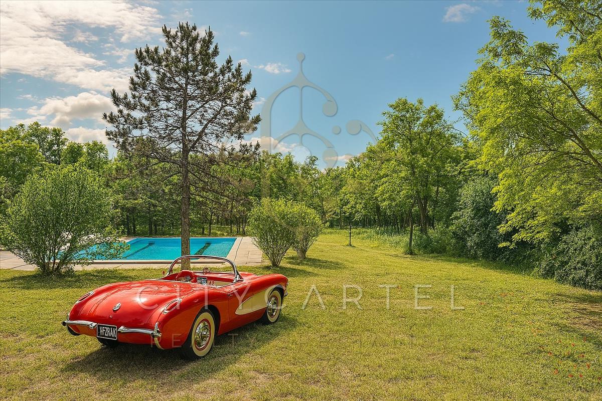 A villa keleti teraszát szinte öleli a napfény. a dombtetőről a tekintet aranyló gabonatáblákon és zöld erdősávokon siklik végig. Bent a nappaliban a fény és árnyék lassú táncot jár a falakon, a konyhából friss kenyér illata terül szét. a pince mélyén sorakozó borospalackok és a biliárdasztal mellett függő lámpa egy nyugodtabb korszak hangulatát idézi.