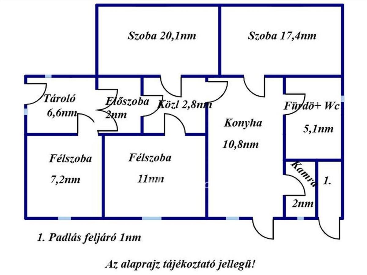 Az ingatlan helyiségei: 2 szoba, 2 félszoba, előszoba, közlekedő, konyha, fürdőszoba wc-vel, kamra, tároló. a padlásfeljáró a teraszról érhető el.