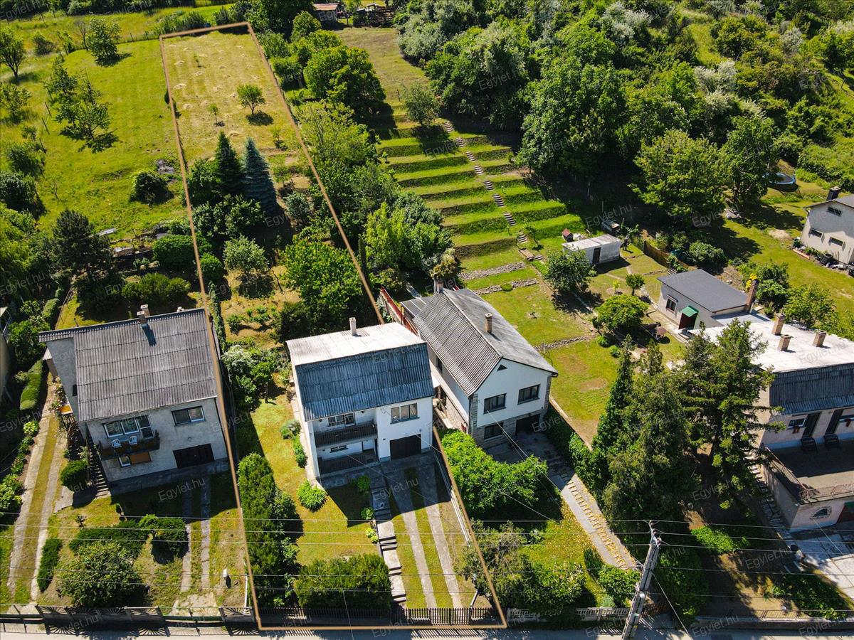 A körbekerített, összközműves napfényes telek 1792 m2 területű, teraszos elrendezésű, számos termő gyümölcsfát, bokrot, valamint pár tőke csemegeszőlőt tartalmaz.