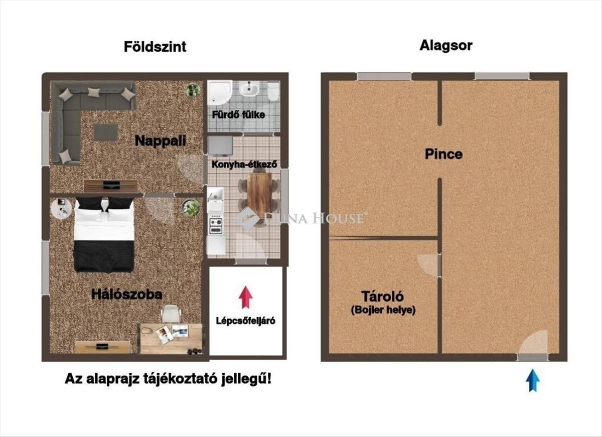 Az ingatlan két szobából, egy konyhából és egy kisebb fürdőszobából áll. Az alagsorban pince és tárolóhelyiségek találhatók, amelyek praktikus megoldást biztosítanak a háztartási eszközök és tárolás számára.