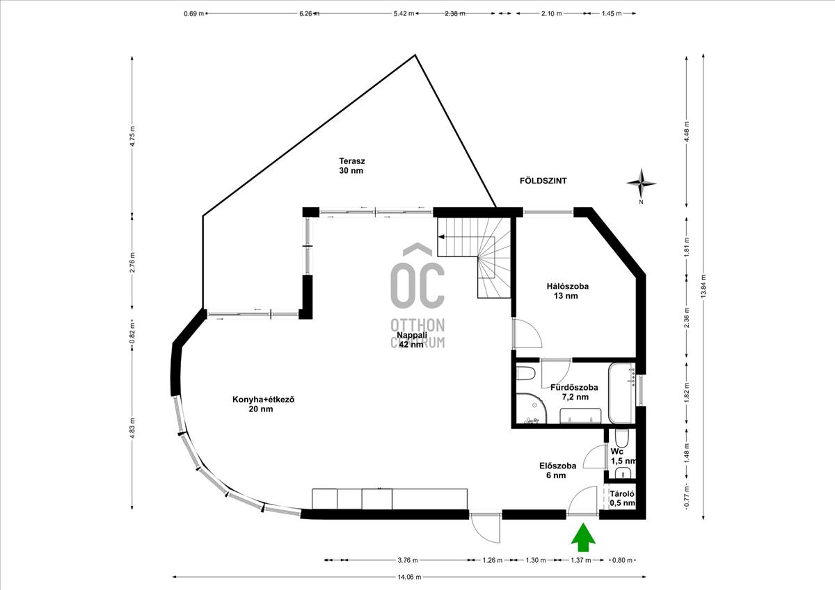 A földszinten egy rendkívül világos, körbenapozott, tágas nappali került kialakításra közvetlen kapcsolattal a 30 nm-es teraszhoz. a konyha igazi különlegesség, rengeteg ablakkal, természetes fénnyel és lélegzetelállító panorámával. a komfortos méretű étkező egy nagyobb családnak is kényelmes teret biztosít, valamint ebből a helyiségből szintén megközelíthető a terasz, ahol a nagy nyílászárók elhúzásával a két tér szinte teljesen egybe nyitható.