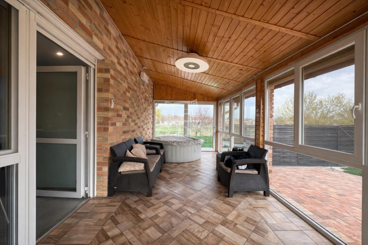 A ház mellett található egy ~50m2-es duplagarázs és tároló helyiség is, mely fa könnyűszerkezetes technológiával épült homlokzati és födémszigeteléssel.
