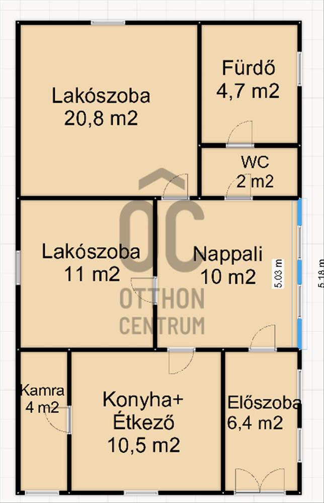 - 2 hálószoba, az egyik 20 m2, a másik 11 m2, nappali, közlekedő, konyha+ étkező, spájz, fürdő, wc helyiségekből áll