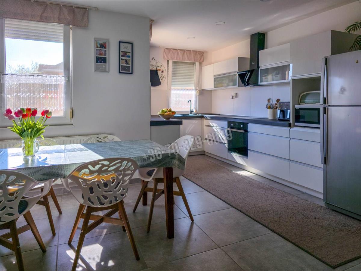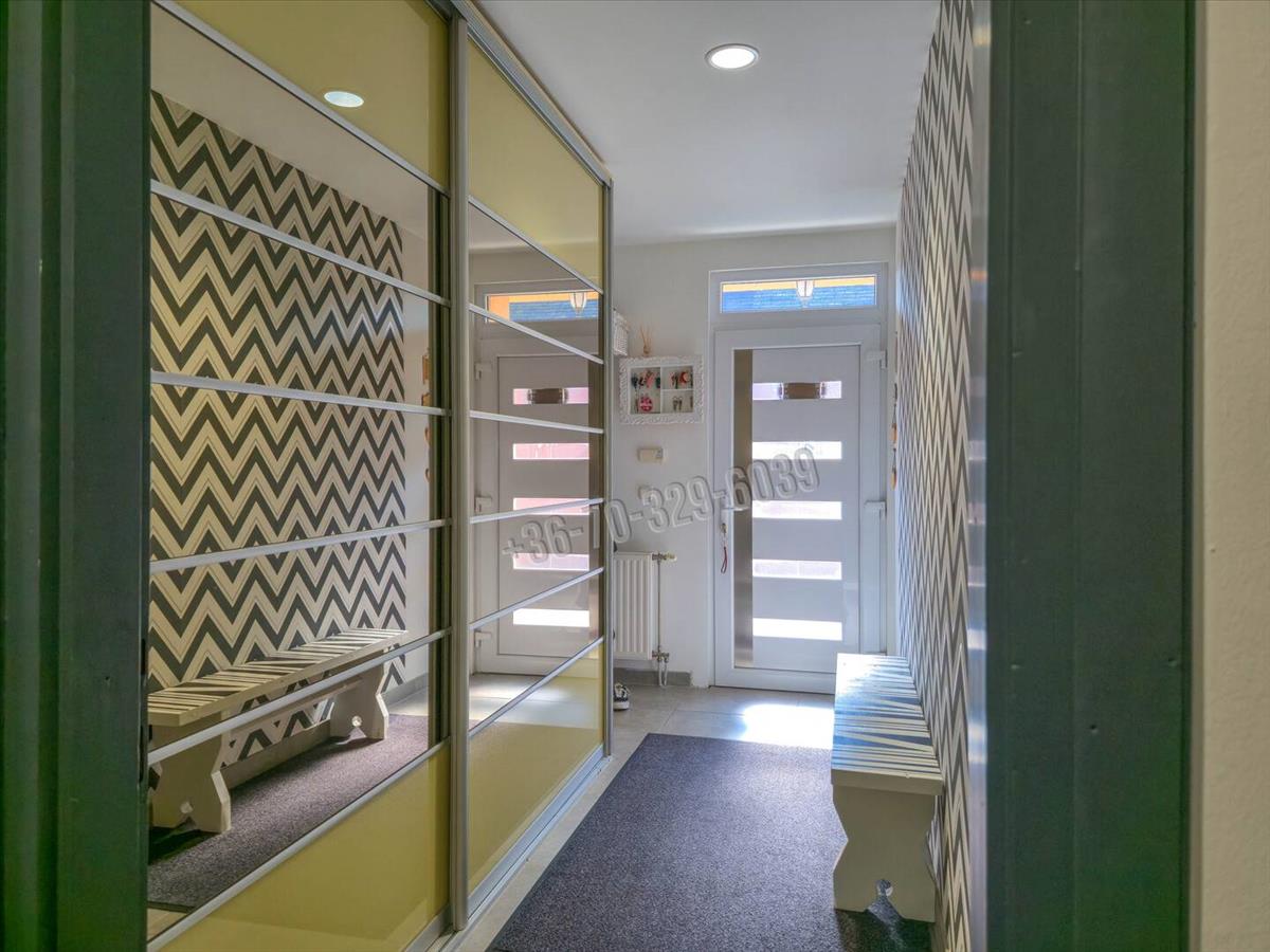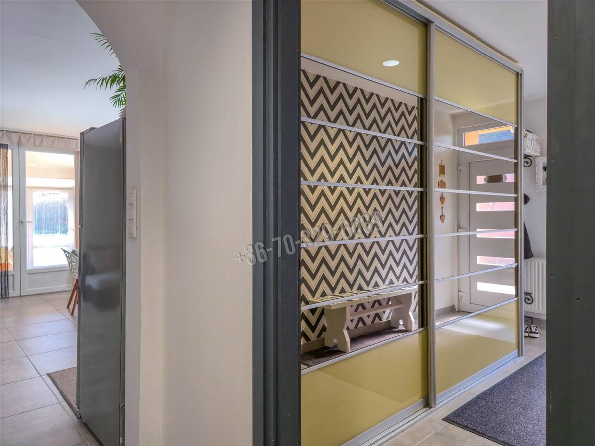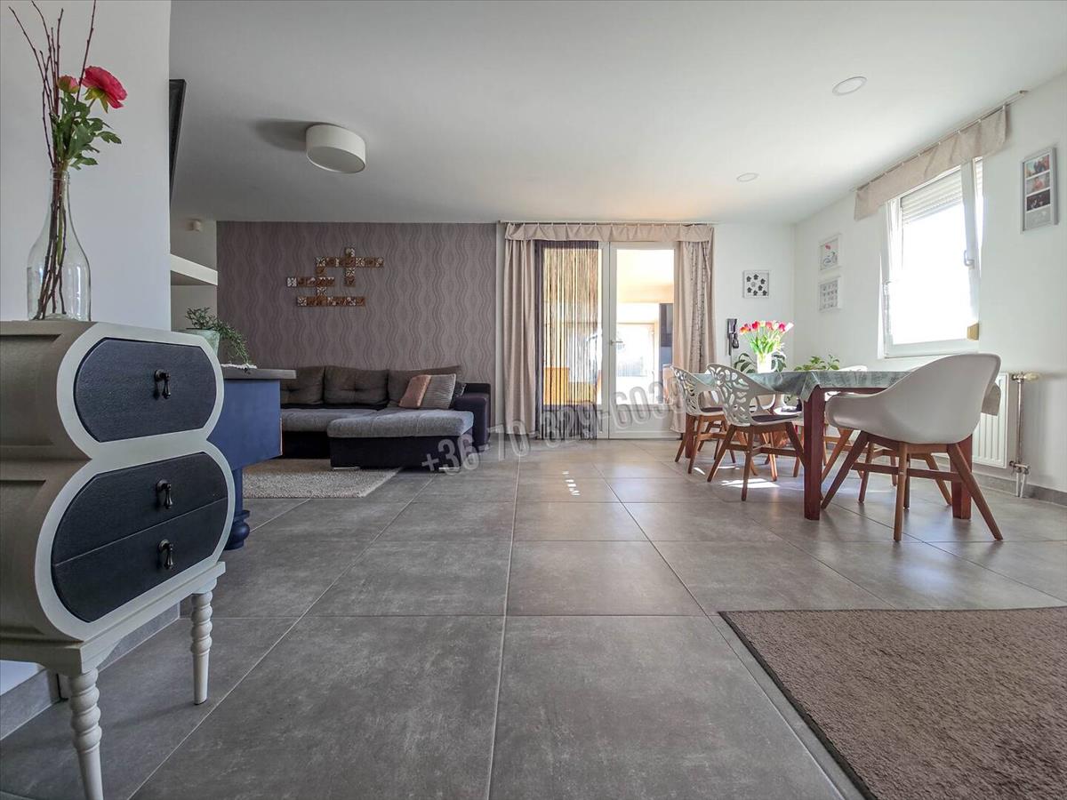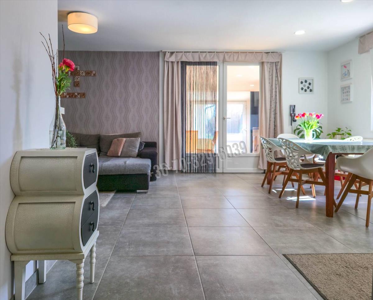 Csendes, kertvárosias környezet, kényelmes, tágas, világos élettér, praktikus elosztás jellemzi ezt az amerikai konyha- nappali, 3 szoba, külön fürdő, külön wc, mosókonyha elosztású otthont, amihez 32 nm -es, jakuzzival felszerelt beépített terasz/télikert tartozik.