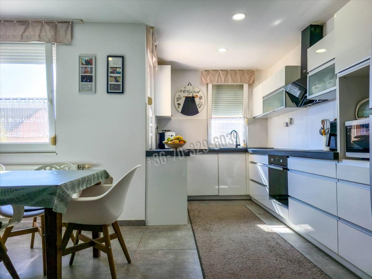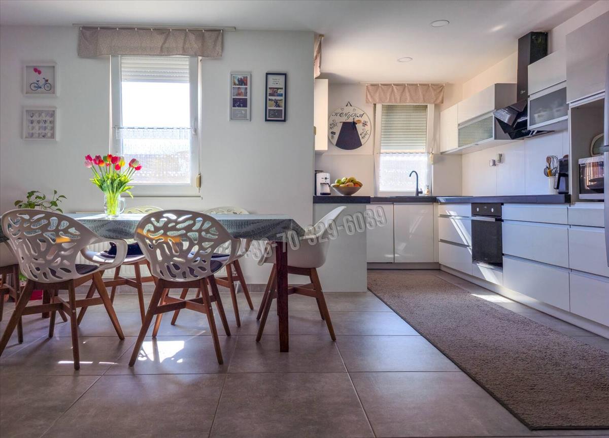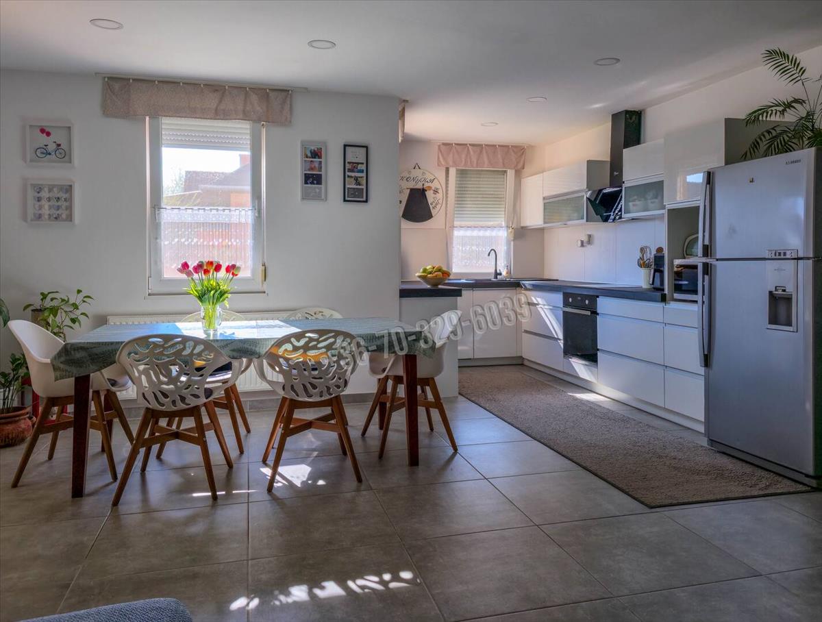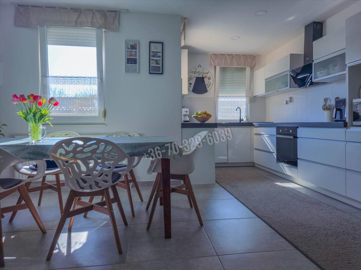 Csendes, kertvárosias környezet, kényelmes, tágas, világos élettér, praktikus elosztás jellemzi ezt az amerikai konyha- nappali, 3 szoba, külön fürdő, külön wc, mosókonyha elosztású otthont, amihez 32 nm -es, jakuzzival felszerelt beépített terasz/télikert tartozik.