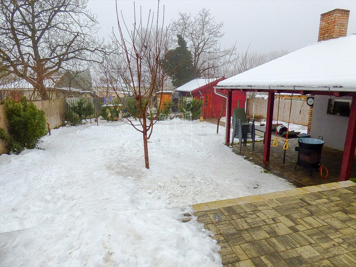 A kert rendezett, karbantartott, gyönyörű babérmeggy sorral körbekerített, ezzel is biztosítva az intim szférát. a hátsó rész alkalmas kikapcsolódásra, pihenésre, az oldalsó részen automata kapun keresztül megközelíthető felszíni gépkocsi beálló (akár 5 autó számára) kapott helyet, továbbá ásott - gyűrűs kút, öntöző rendszer, robot fűnyíró és a kert végében lévő 45 nm-es szigetelt tároló áll az új tulajdonosok rendelkezésére.
