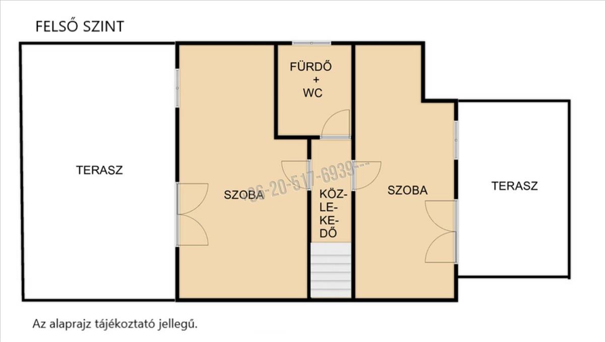 A felső szintre kényelmes, impozáns, fából készült lépcső vezet, itt két tekintélyes méretű szoba, egy közlekedő, valamint egy zuhanyzós fürdő + wc kapott helyet. Mindkét szoba rendkívül világos. Kuriózum, hogy mindkettőhöz szokatlanul nagyméretű terasz kapcsolódik. (60m2, 28m2)