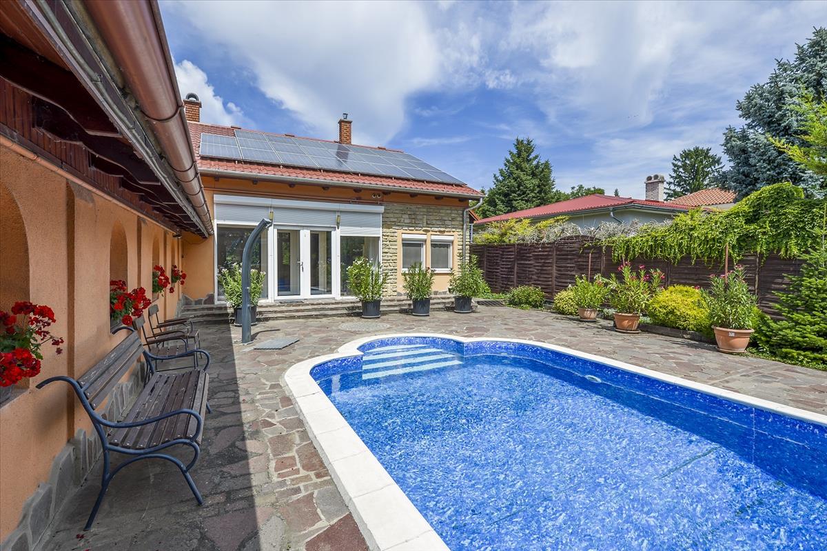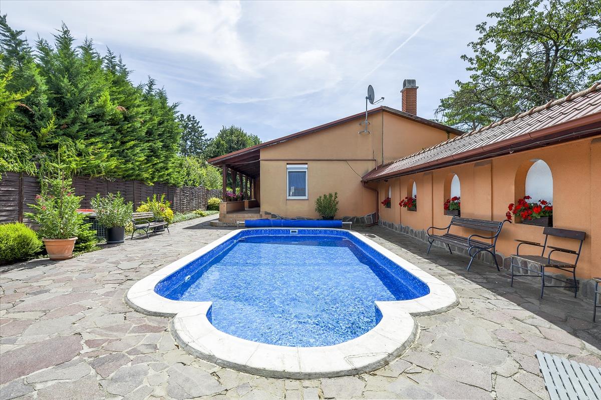 A főépület és a melléképületek között található még egy 8x4 méteres hőszivattyúval fűtött, zsalukőből épített, fóliázott, automata vegyszerezésű, külön gépészeti aknával ellátott medence is melyet terméskővel burkoltak körbe és napozóterasszal láttak el.
