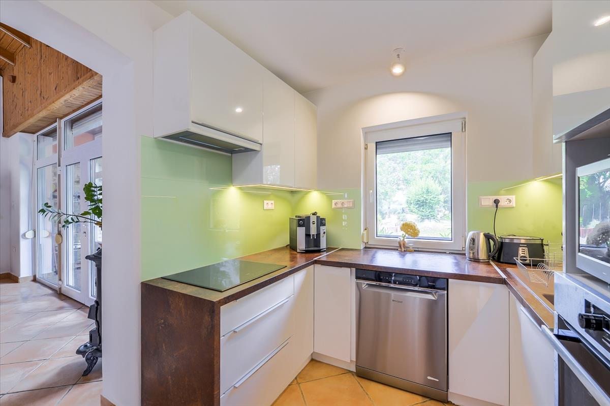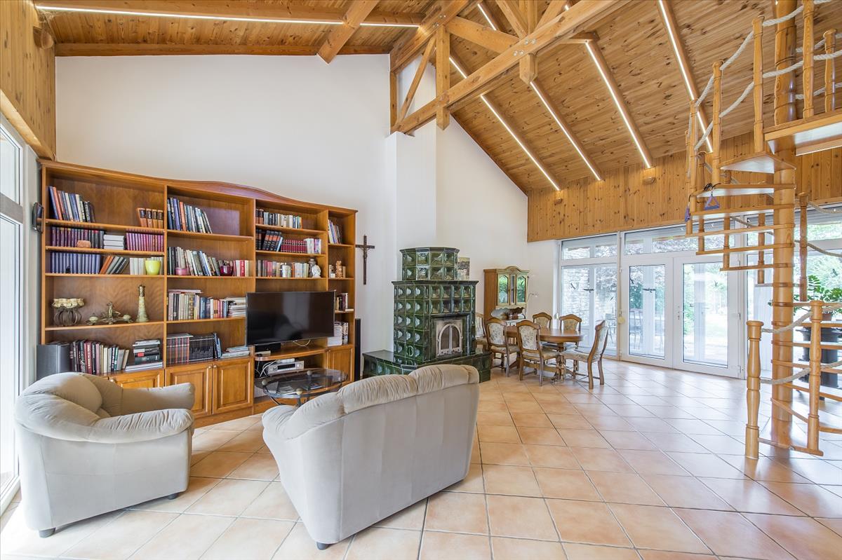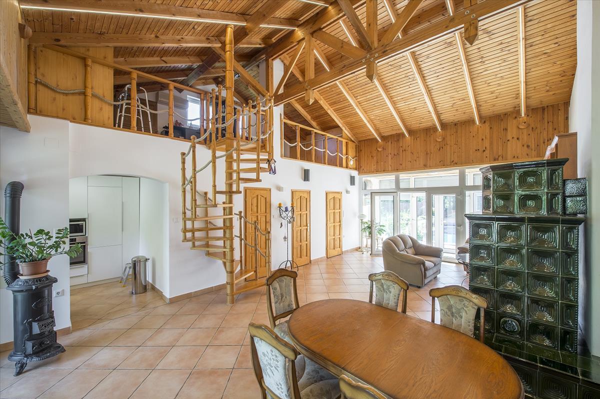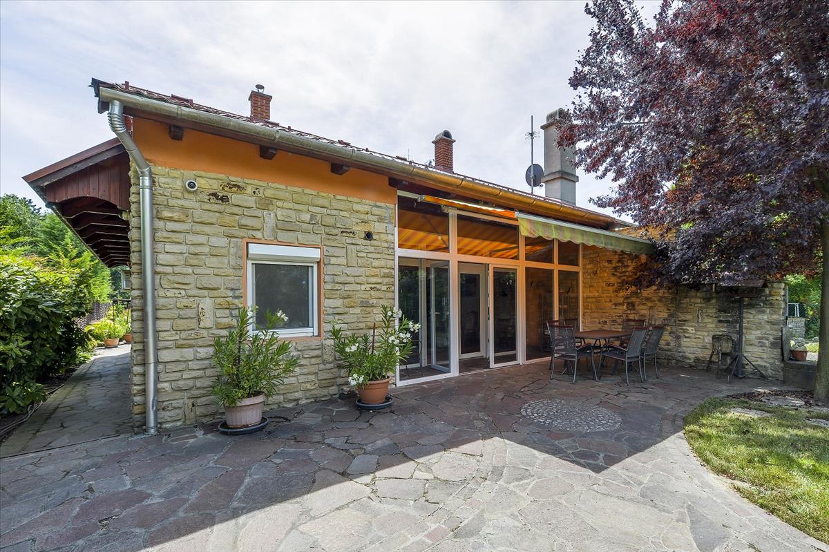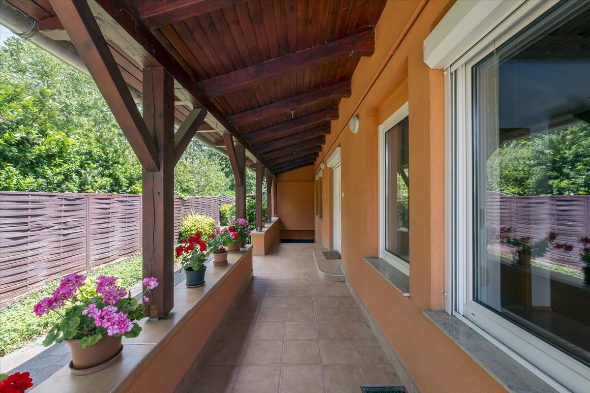 Az udvaron a medence mellett tovább haladva érkezünk a galériás főépületbe. a terméskővel kirakott homlokzatú főépületben fürdő, külön Wc, háló, nappali, étkező, konyha és a nappaliból elérhető tágas galéria kapott helyet. Az épületen átsétálva, a telek Duna parti része gyönyörűen parkosított, szalonnasütővel és díszburkolattal tarkított valamint vakond-hálóval ellátott. a kertben lett kialakítva a 45 m2-es borpince lejárója is, ami kivételes hangulatúvá teszi az egész kertet.