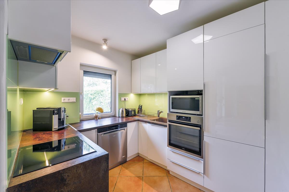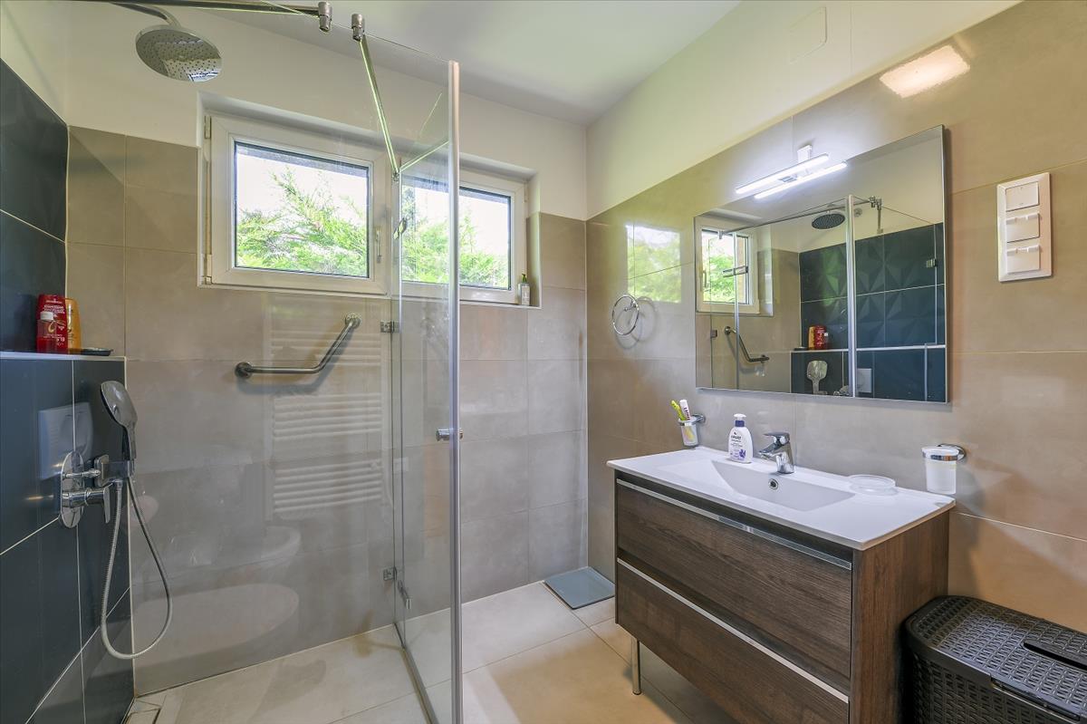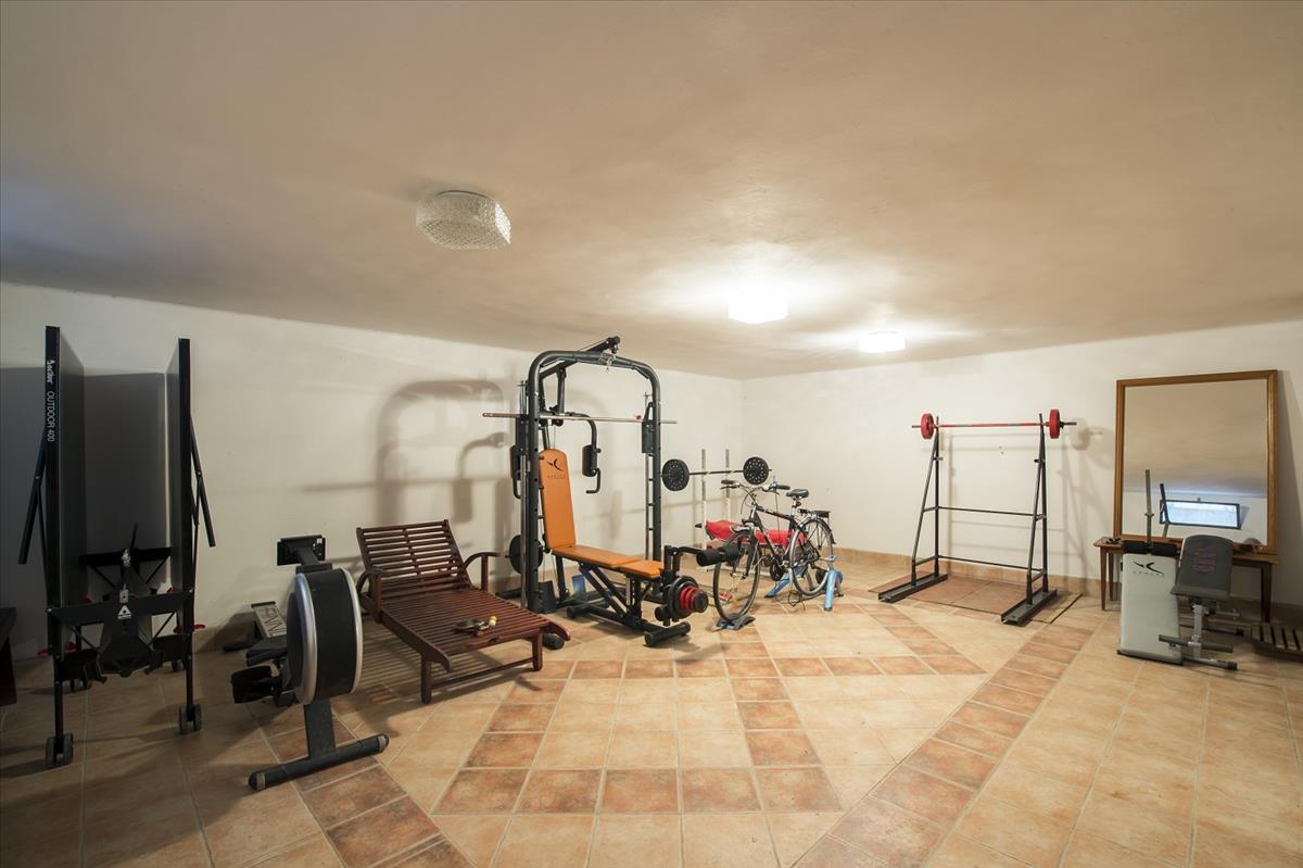 A garázs után találjuk a fedett teraszos melléképületet, melyben két, mindennel felszerelt, önálló lakrész lett kialakítva. a melléképületeket és a főépületet egy hosszú épület köt össze, melyben a 110 m2-es konditerem és szuterén található.
