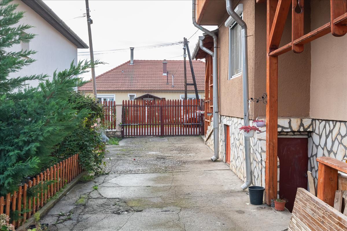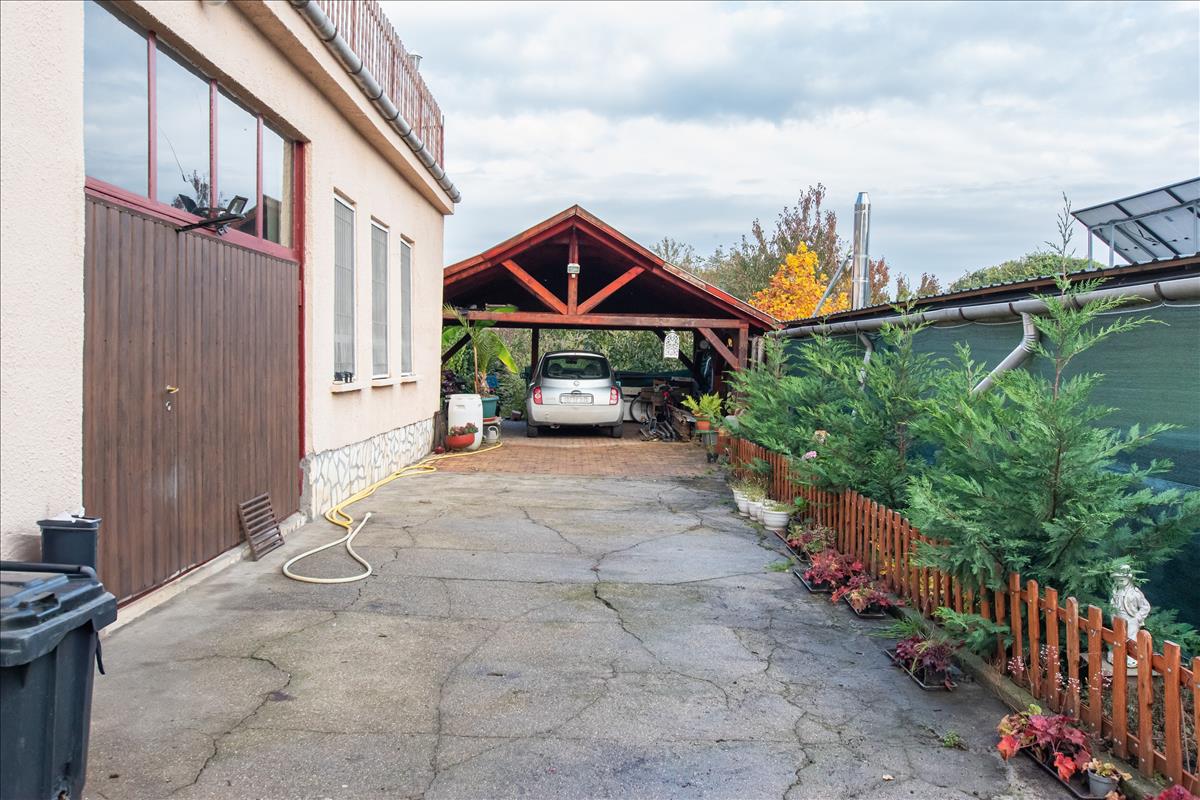 Az udvar részben betonozott, ahol két autó parkolására is kényelmesen használható fedett autóbeálló lett kialakítva, a kert további része gyümölcsfákkal gazdagon telepített. a ház háta mögött egy 60 m²-es fűthető épület található szerelőaknával, beépített szaunával. Tökéletes hely a hobbihoz, kreatív projektekhez vagy akár kisvállalkozás indításához.