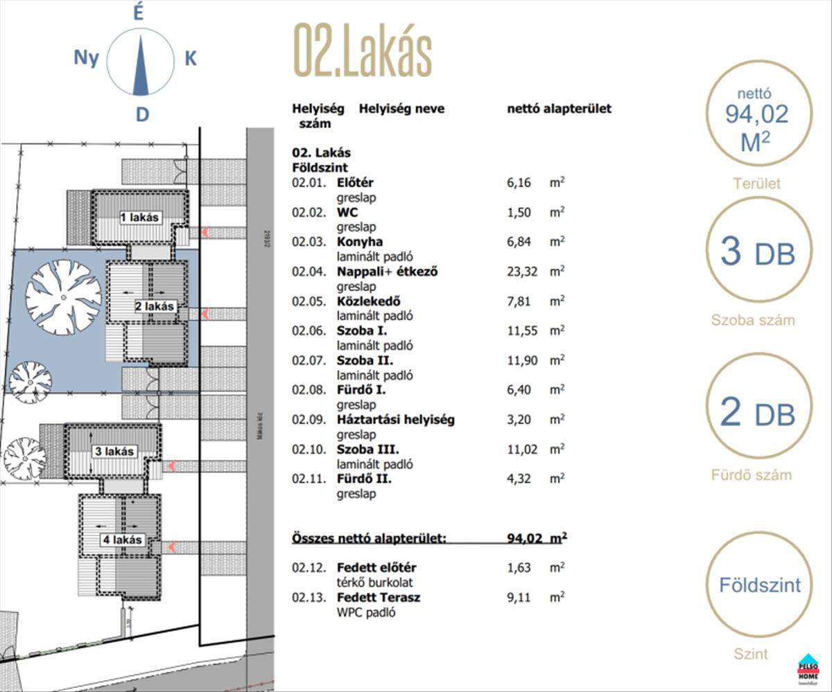 Az ingatlan hasznos alapterület 94m2 + 9, 11m2 fedett terasz, és egy privát kb 250m2 saját udvar. Az épület földszintes, nappali, teljesen felszerelt konyha, étkező, tároló, előtér, vendég wc található. . . 3 Teljes értékű hálószoba, két fürdőszoba zuhannyal és káddal és wc-vel, mosókonyha/háztartási helyiség.