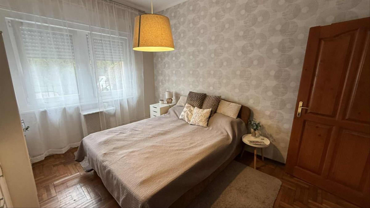 tágas, világos hálószoba, kettő félszoba, fürdőszoba zuhanyzóval, folyosó, gépesített, modern konyha és étkező, valamint egy kertre néző, világos nappali, ahonnan a fedett, hangulatos teraszra érünk.