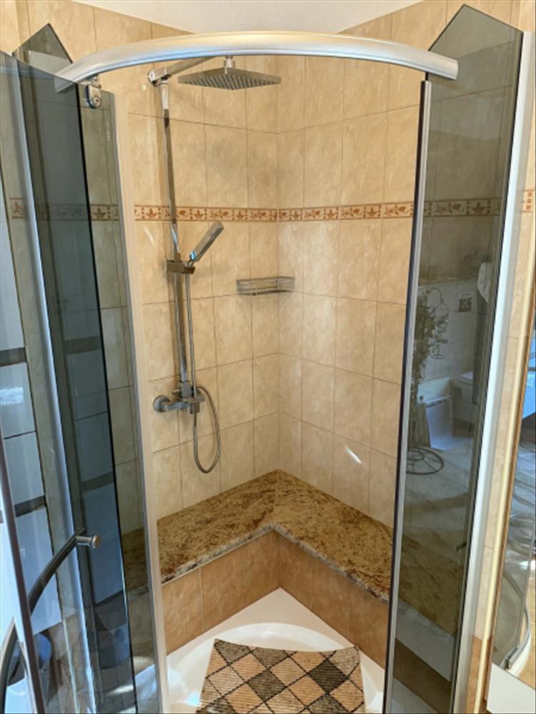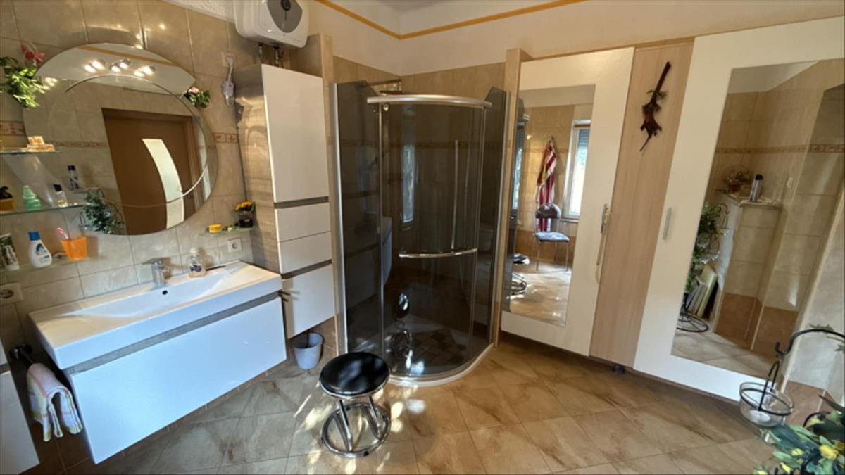 A konyhából de akár külön bejáraton is egy külön lakrészbe érünk, ami kb 30 m2-es, saját fürdőszobával.