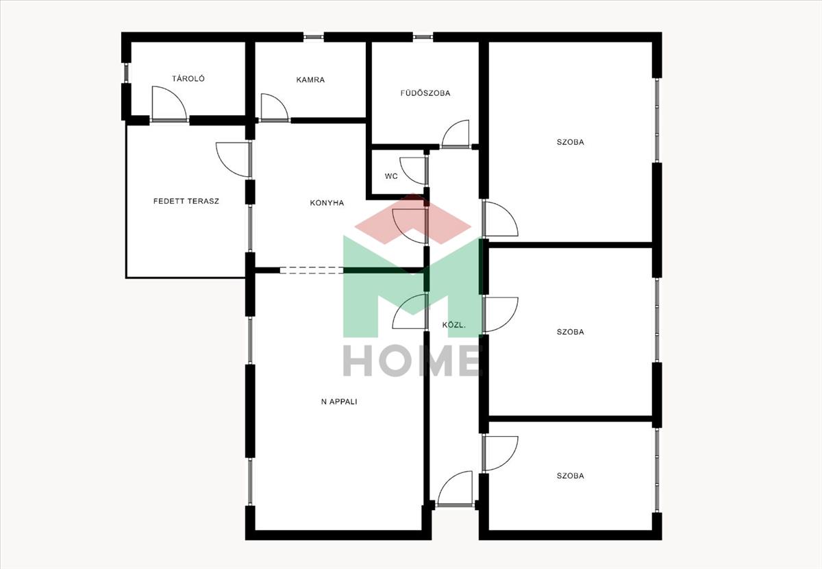 A lakrész helységei: 3 szoba, nappali, közlekedő, konyha, kamra, fürdőszoba, külön mellékhelység, valamint fedett terasz