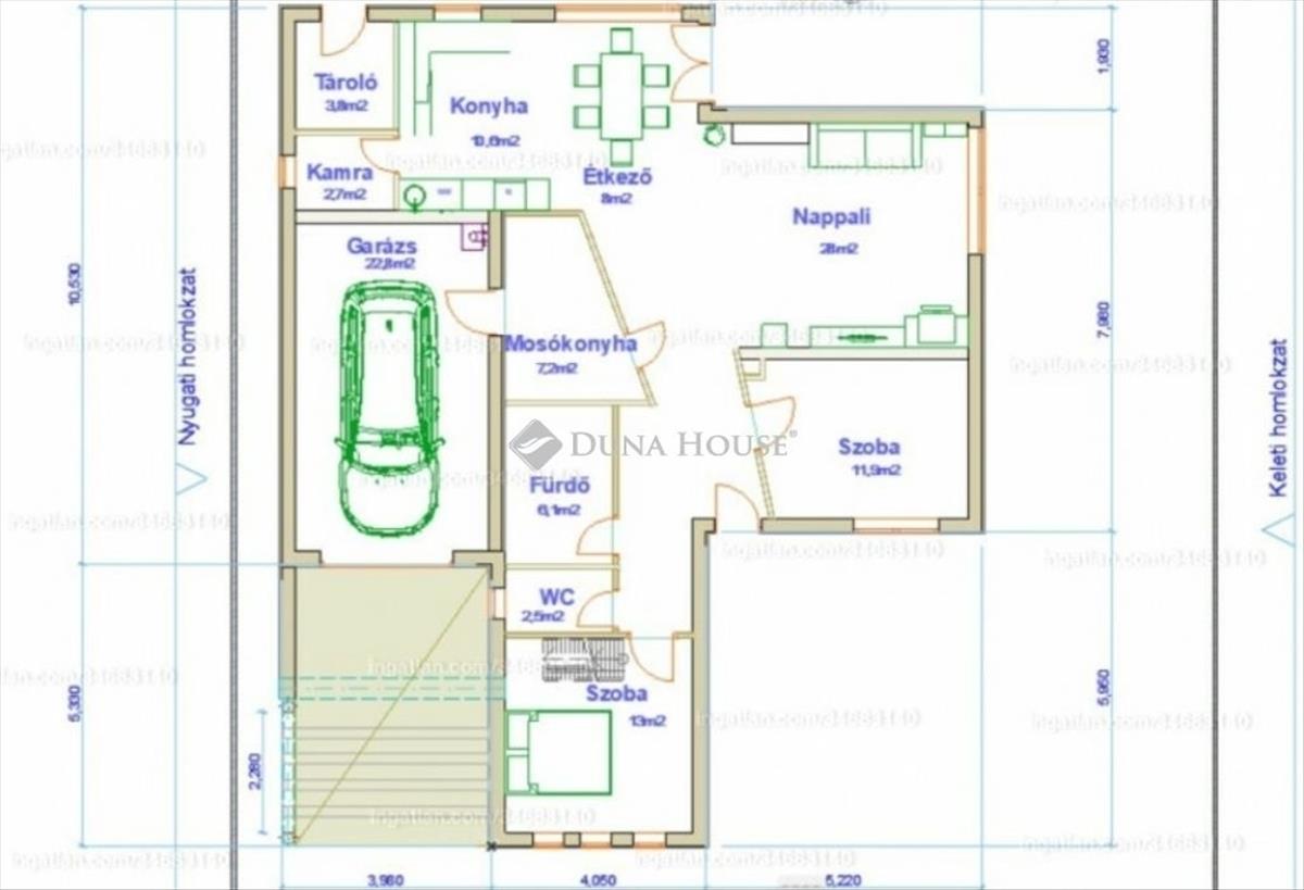 Földszint: amerikai konyhás nappali, kamra, mosókonyha, tároló, 2 háló, fürdőszoba, külön wc, fűtött garázs