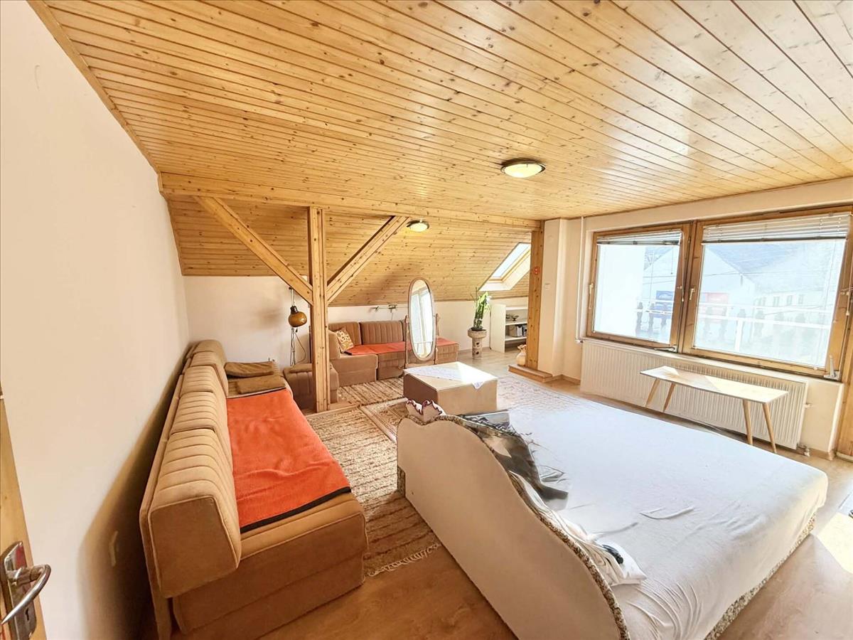 Emelet: 2 hálószoba, fürdőszoba, erkély, konyhának alkalmas rész (vizesblokk kiépítve)