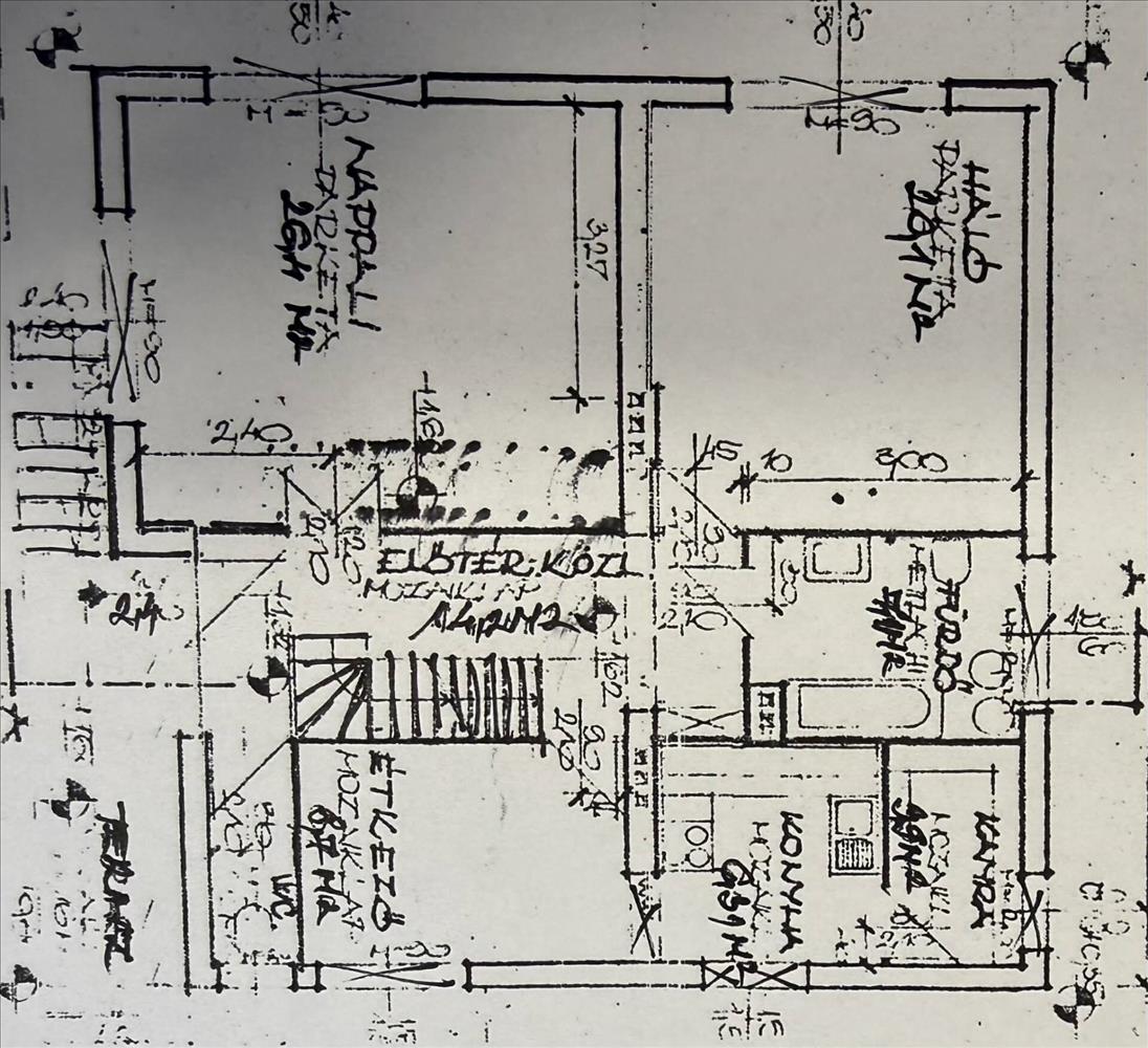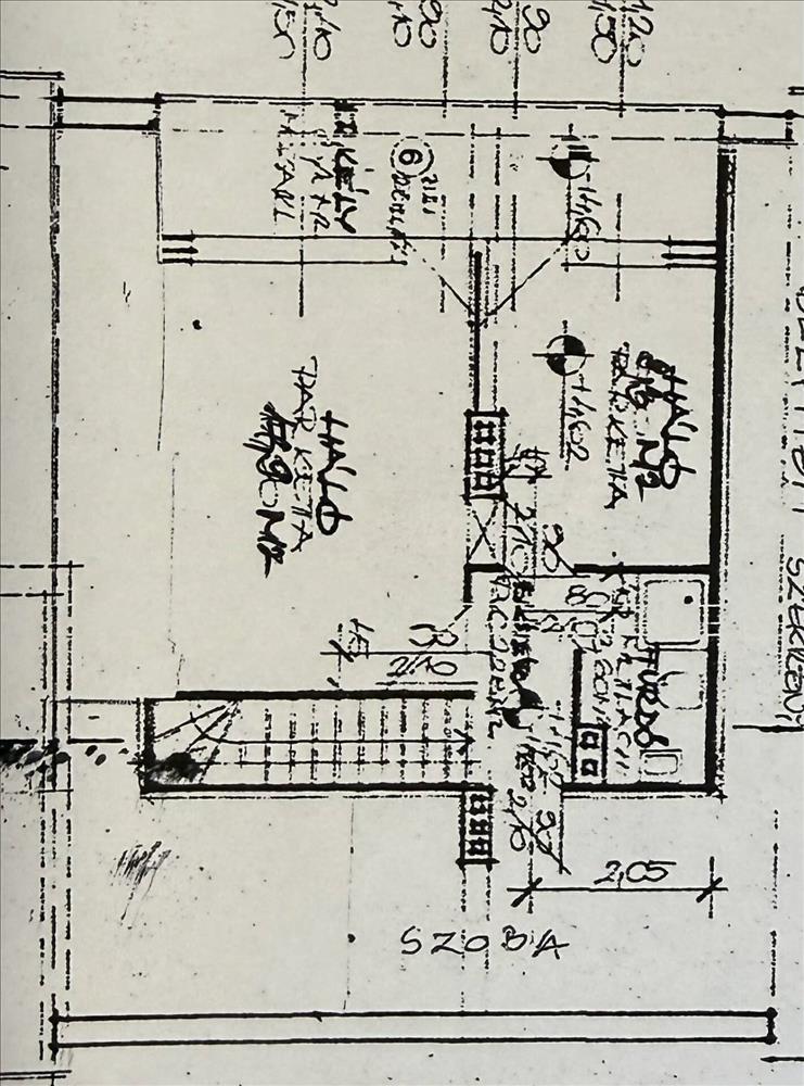 Emelet: 2 hálószoba, fürdőszoba, erkély, konyhának alkalmas rész (vizesblokk kiépítve)