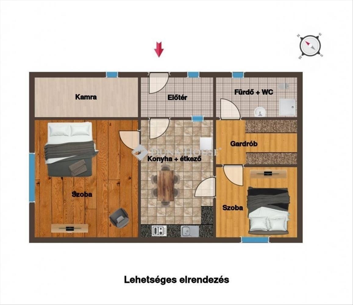 A ház helyiségei: tágas szoba, konyha, fürdőszoba WC-vel, kamra, közlekedő és háztartási helyiség. (A ház könnyedén 2 szobássá alakítható)