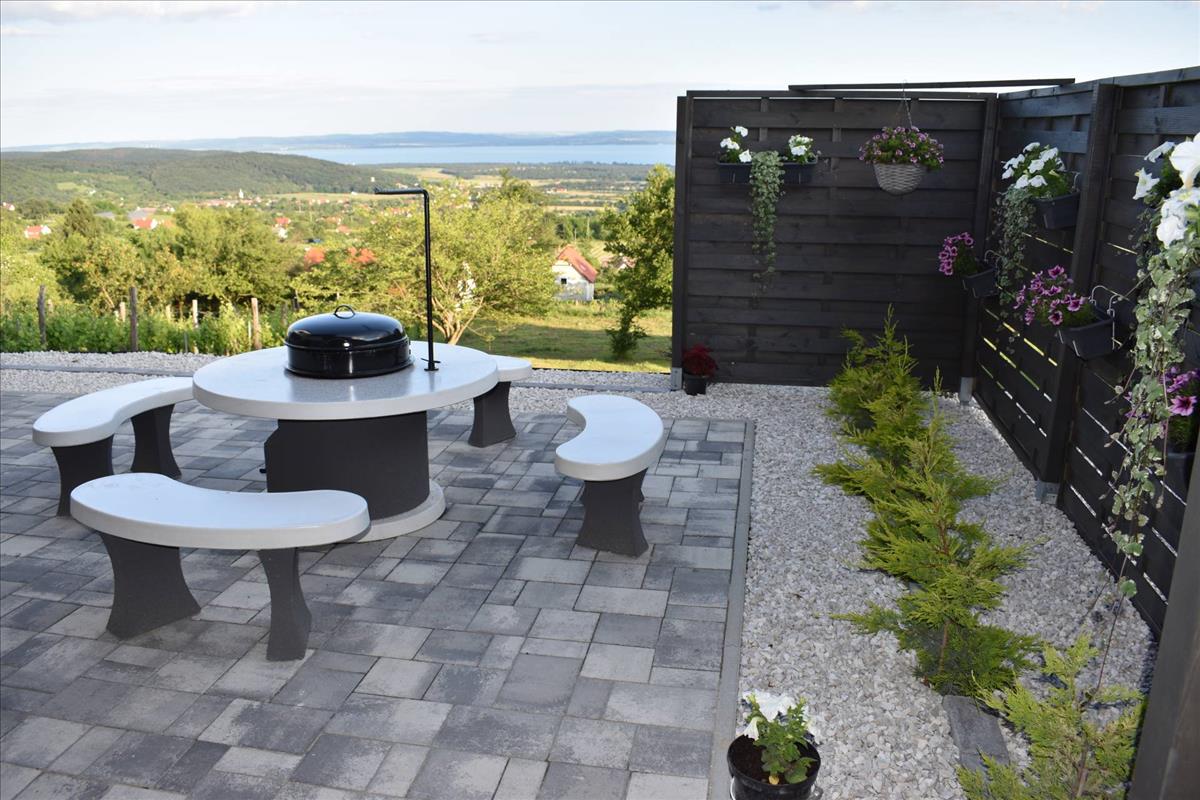 A vendégház teraszáról és a szobákból is fantasztikus kilátás nyílik a szőlőhegyekre és a Balatonra.