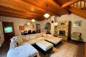 A hatalmas nappali épített kandallóval és látványos fagerendákkal teszi igazán otthonossá a teret.