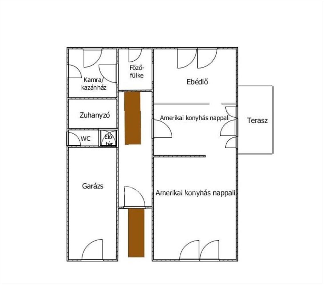 Az alsó szinten amerikai konyhás nappali, étkező/ebédlő, főzőfülke, kamra/kazánház, felülről fedett terasz, wc, különálló fürdő (zuhanyzó), előtér, előszoba és külön bejáratos de szobává is alakítható garázs található.