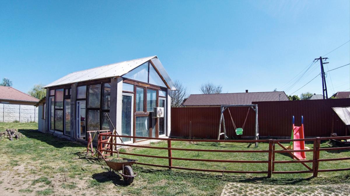 Üvegház (a vételár része): 35 m², fűthető, 32 mm polikarbonát tető, szigetelt üveg oldalak, fa-beton szerkezet, műanyag ajtók – alkalmas növénytermesztésre vagy egyéb célra