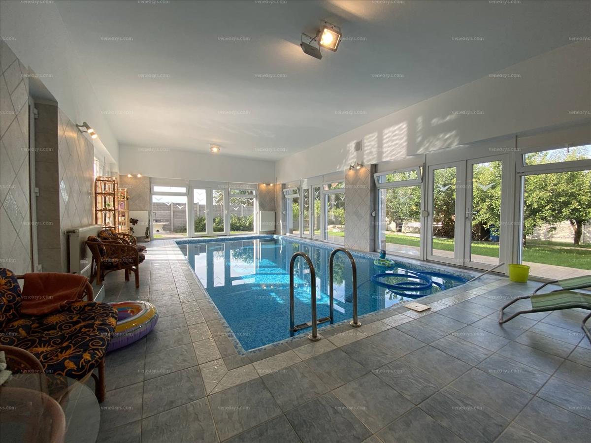 • Wellness-tér (86 nm), melyben 8x4 m-es, 1, 60 m mély fűtött medence található. Erről gázkazán gondoskodik, keringető szivattyúval, szűrőberendezéssel és párátlanítóval ellátva, mely hőszivattyúként is funkcionál. a medencetér belmagassága 2, 7 m.