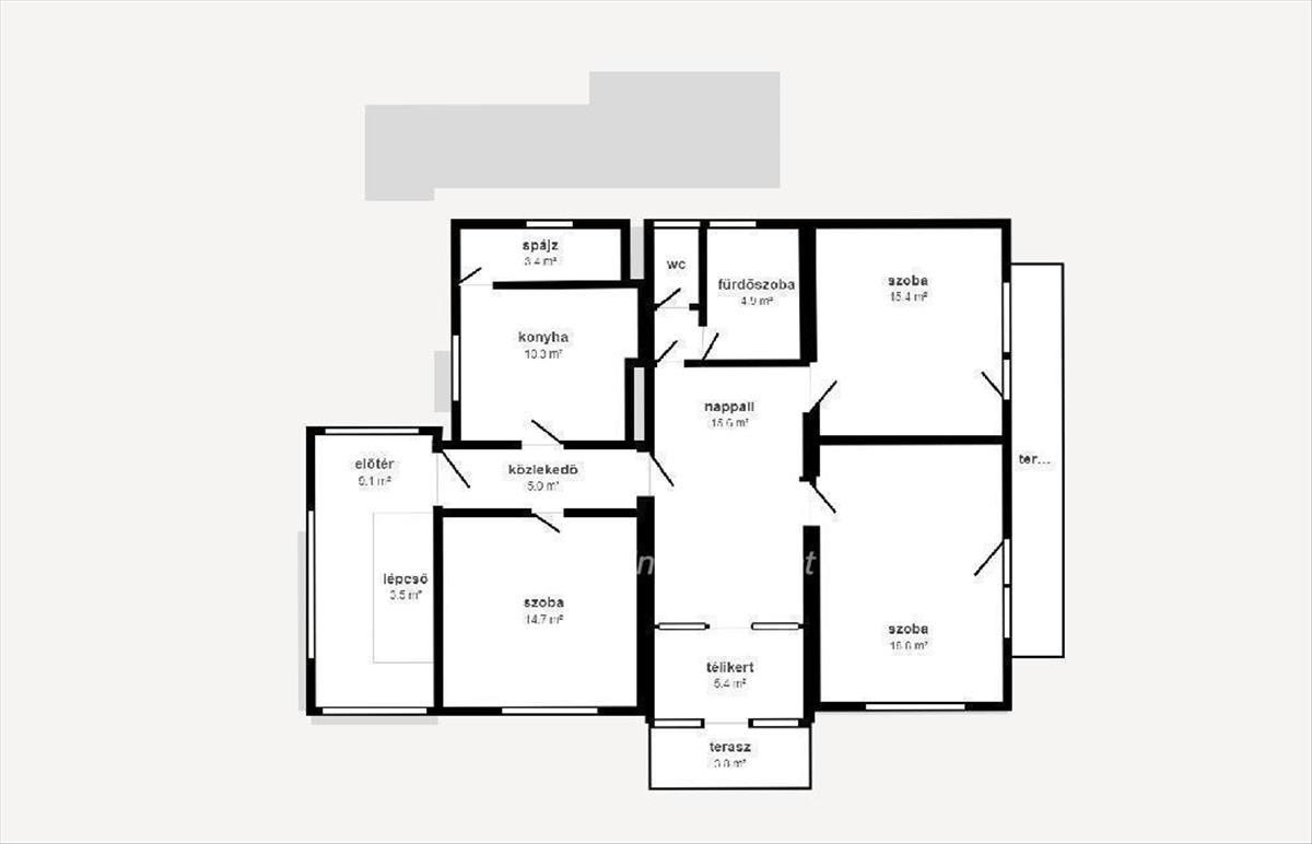 Az első lakószinten 3 teljes értékű szoba, konyha + spájz, nappali, külön fürdőszoba és wc kapott helyett. Az első lakószint hasznos alapterülete 101nm.