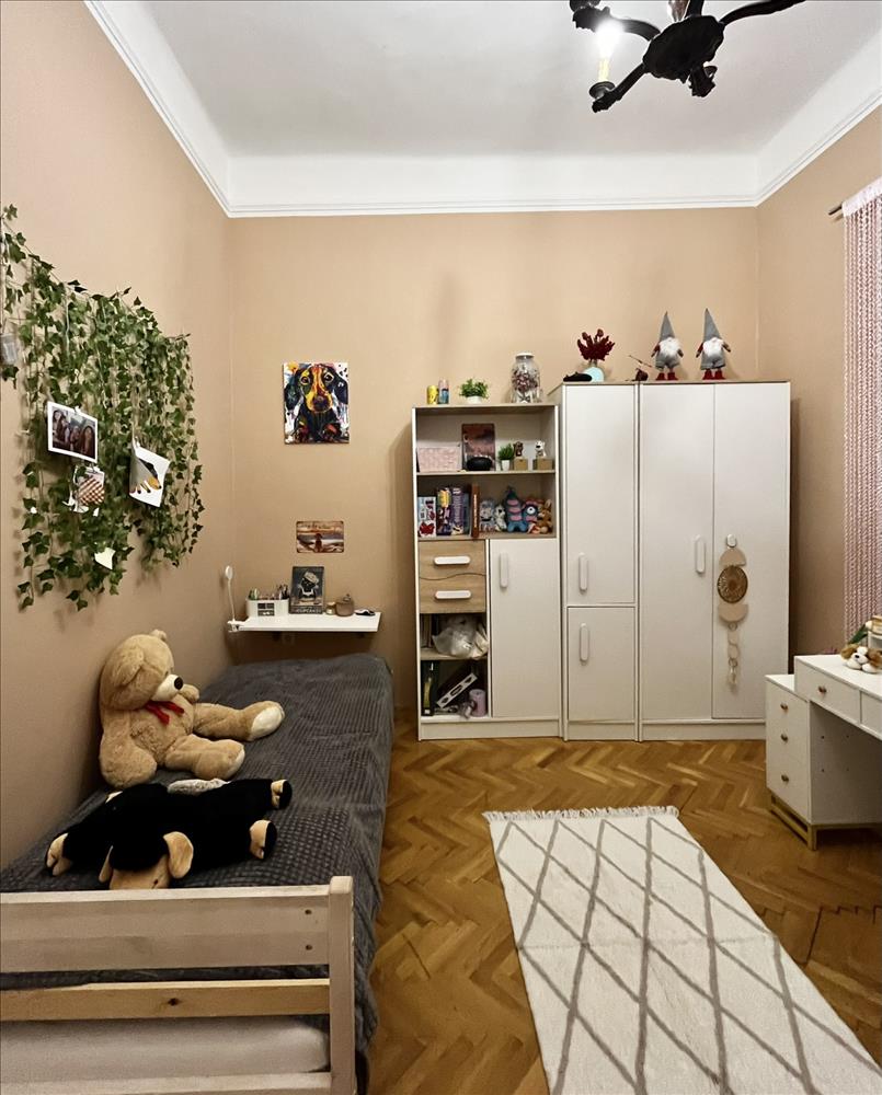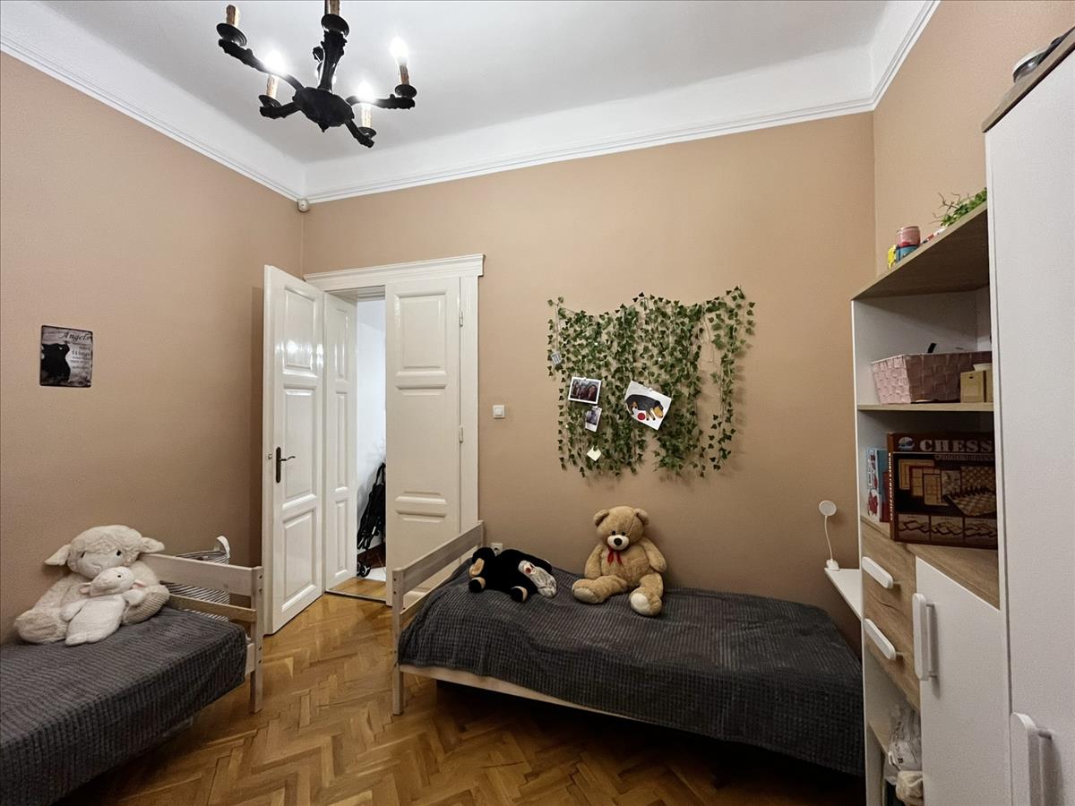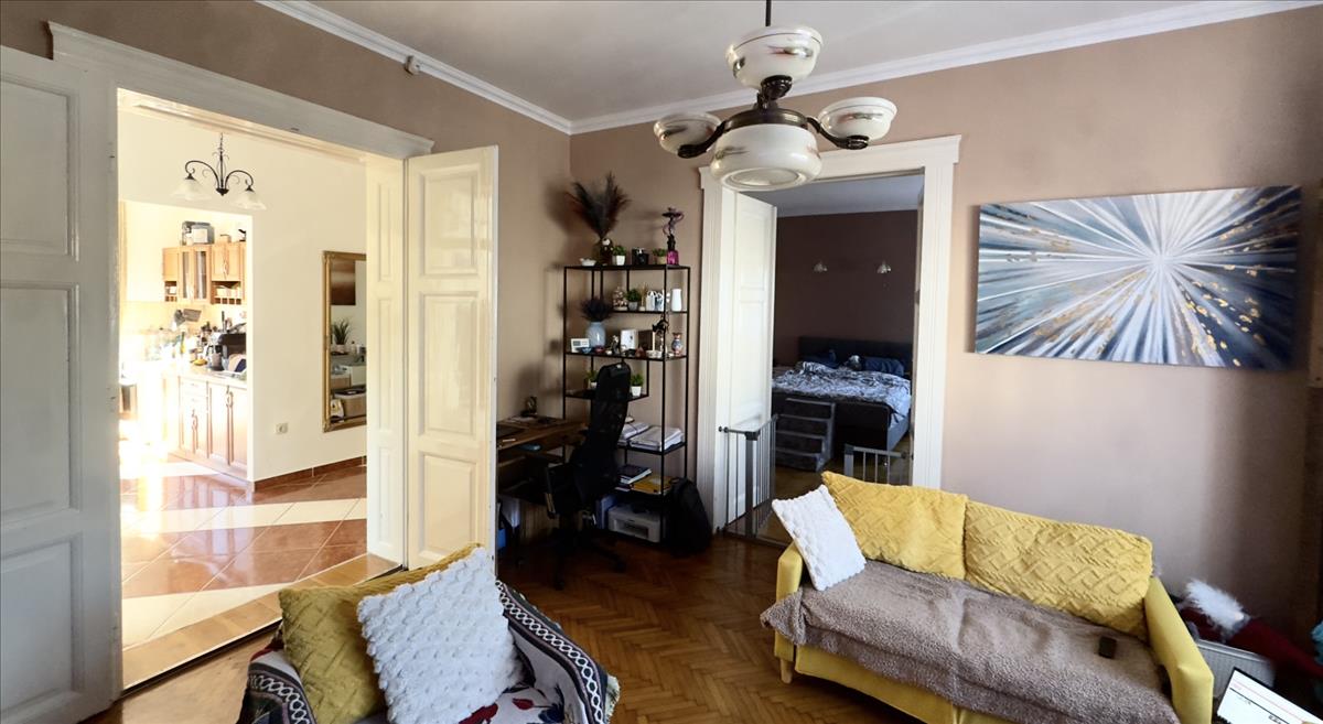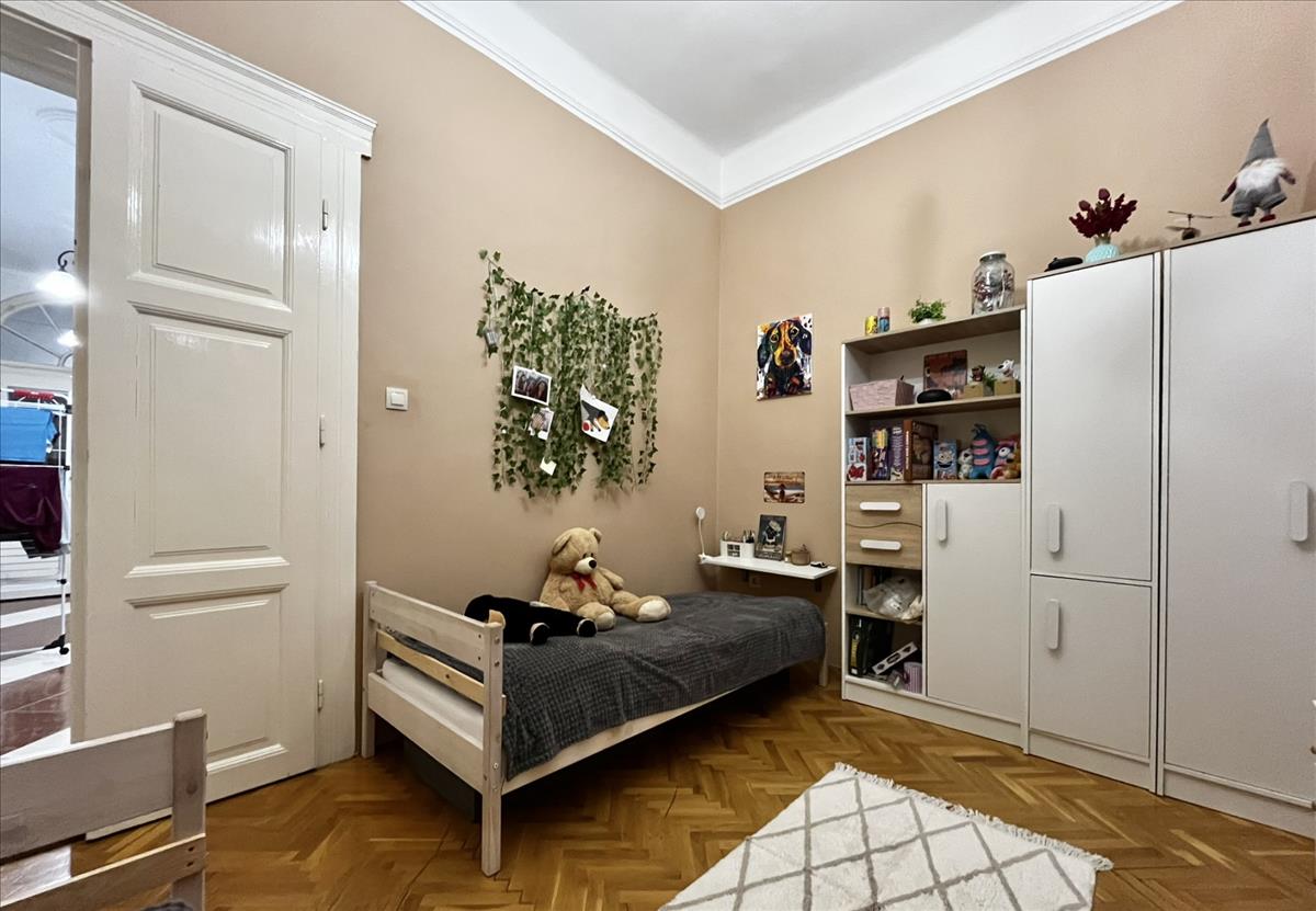 A lakás három külön bejáratú szobát kínál. a szobák nagyméretű ablakaiból bőséges természetes fény árad be, ami egész nap világossá teszi a tereket. a parketta jó állapotú, klasszikus halszálkás mintázata pedig otthonos, időtálló hangulatot biztosít.