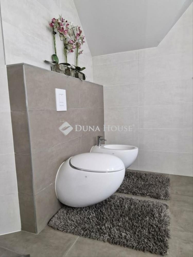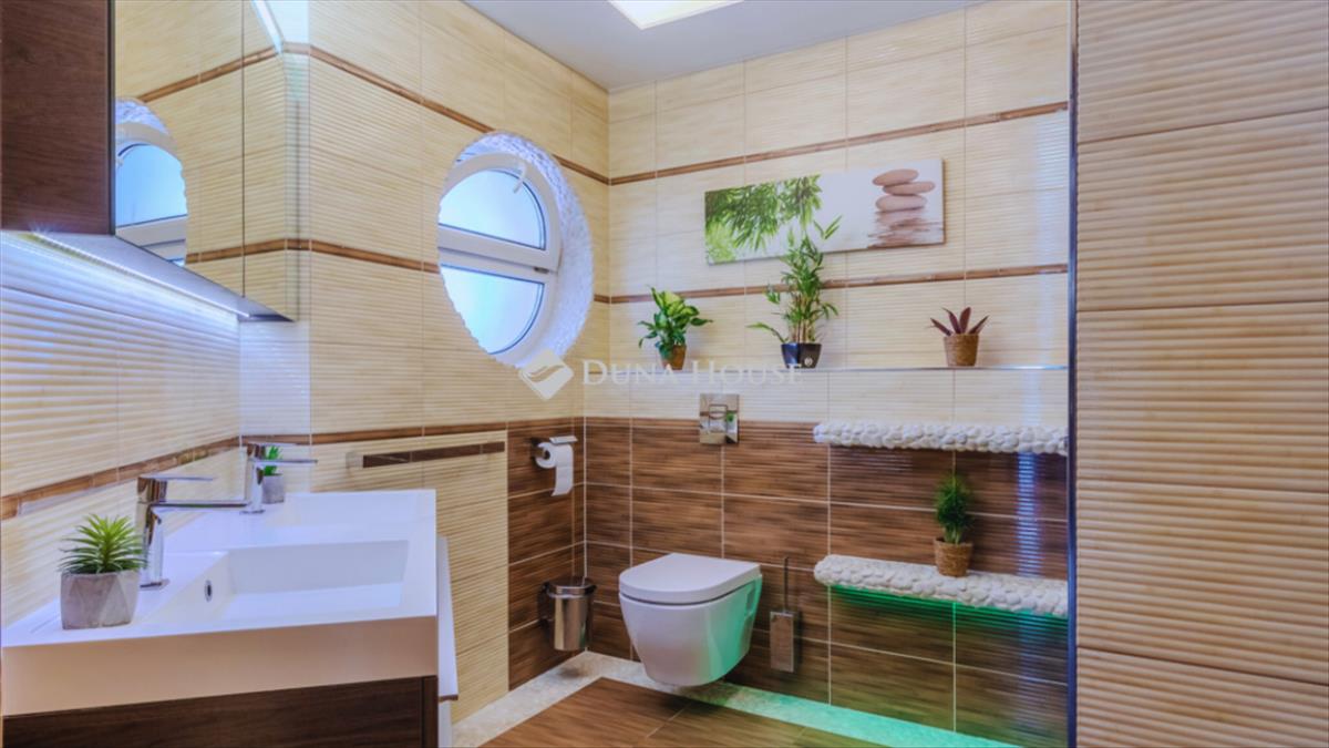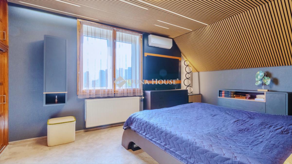 Ez a helység háromféle fűtéssel van ellátva: radiátor, hűtő-fűtő légkondicionáló és egy fatüzeléses, eredeti olasz sparheld, mely fűtésrásegítéses rendszerrel működik. Ezek kombinálhatóak is. a felső szint tetőtér beépítéses, TV-s pihenő előtérrel és kertre néző szobákkal. Itt kapott helyet még a tágas mosókonyha, melyben egy 3 személyes szauna is található.