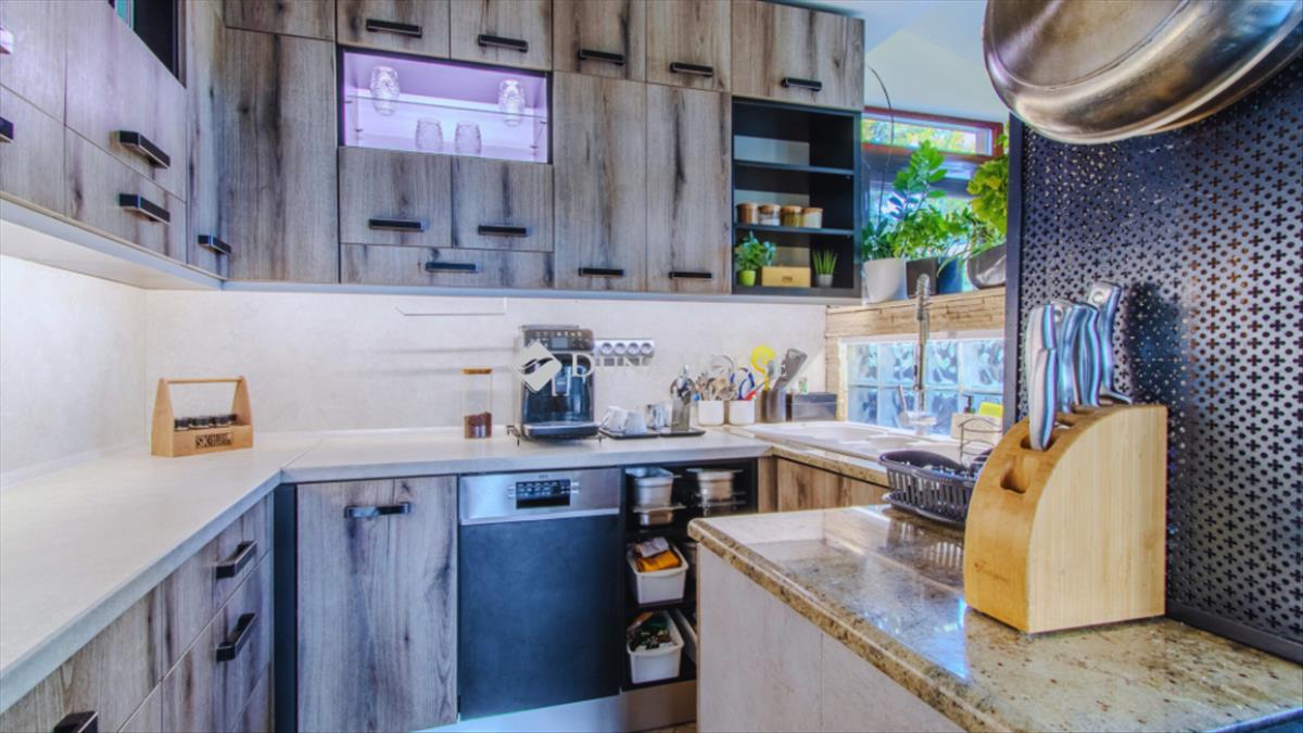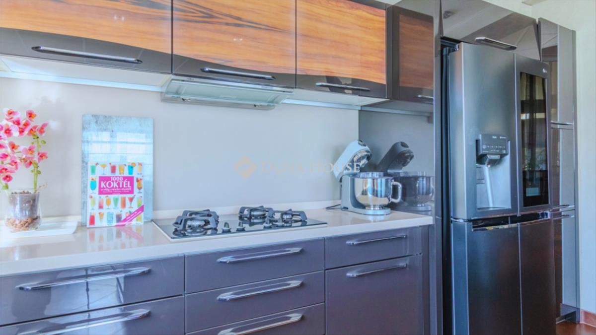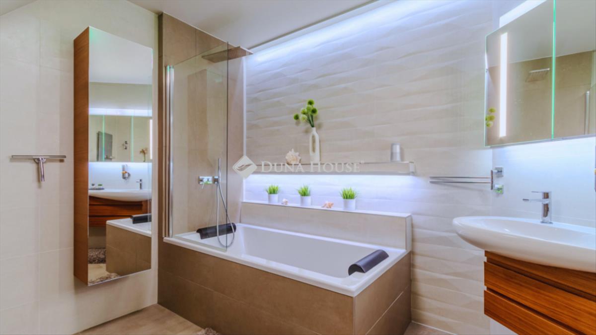 A lakás két fürdőszobával rendelkezik, modern burkolóanyagok felhasználásával és igényes kialakítással. a letisztult, minimál stílusú, gépesített amerikai konyha ad teret a főzéshez. Az ingatlan egyik különleges eleme a nagy méretű, világos beépített terasz, amely teljes értékű konyhával, étkezővel és pihenő sarokkal rendelkezik.