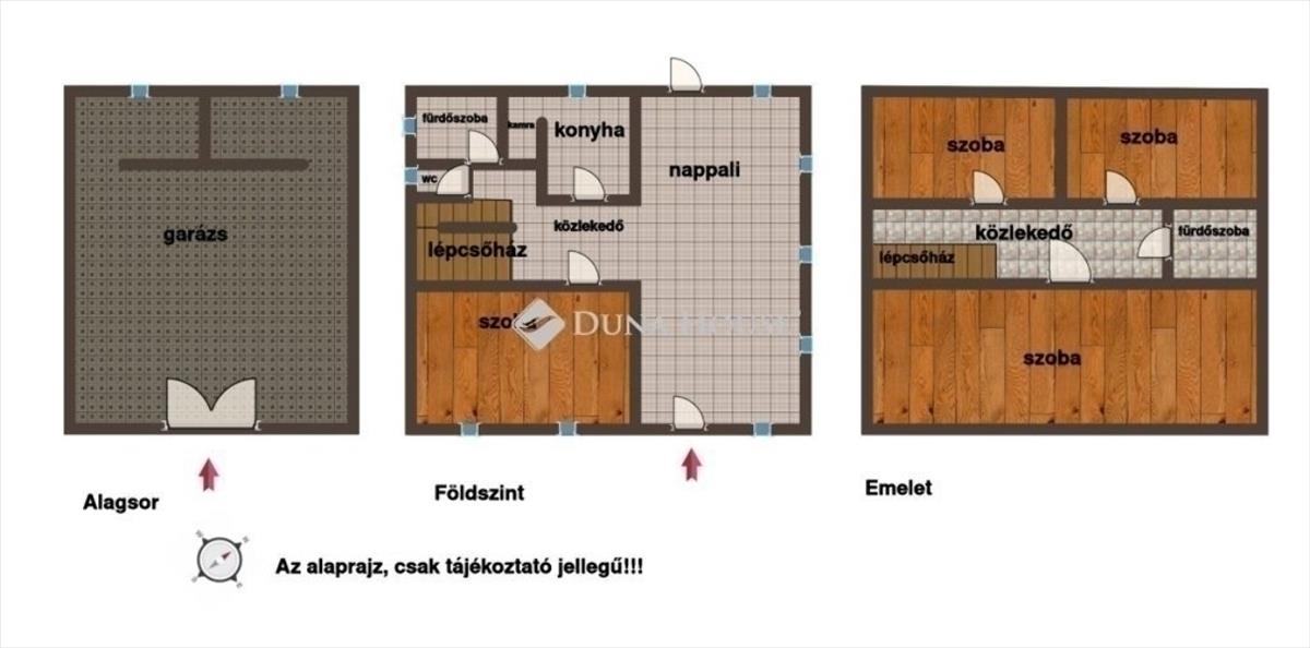 Emelet: 3 nagy szoba (az egyik akár ketté is osztható), fürdőszoba, közlekedő
