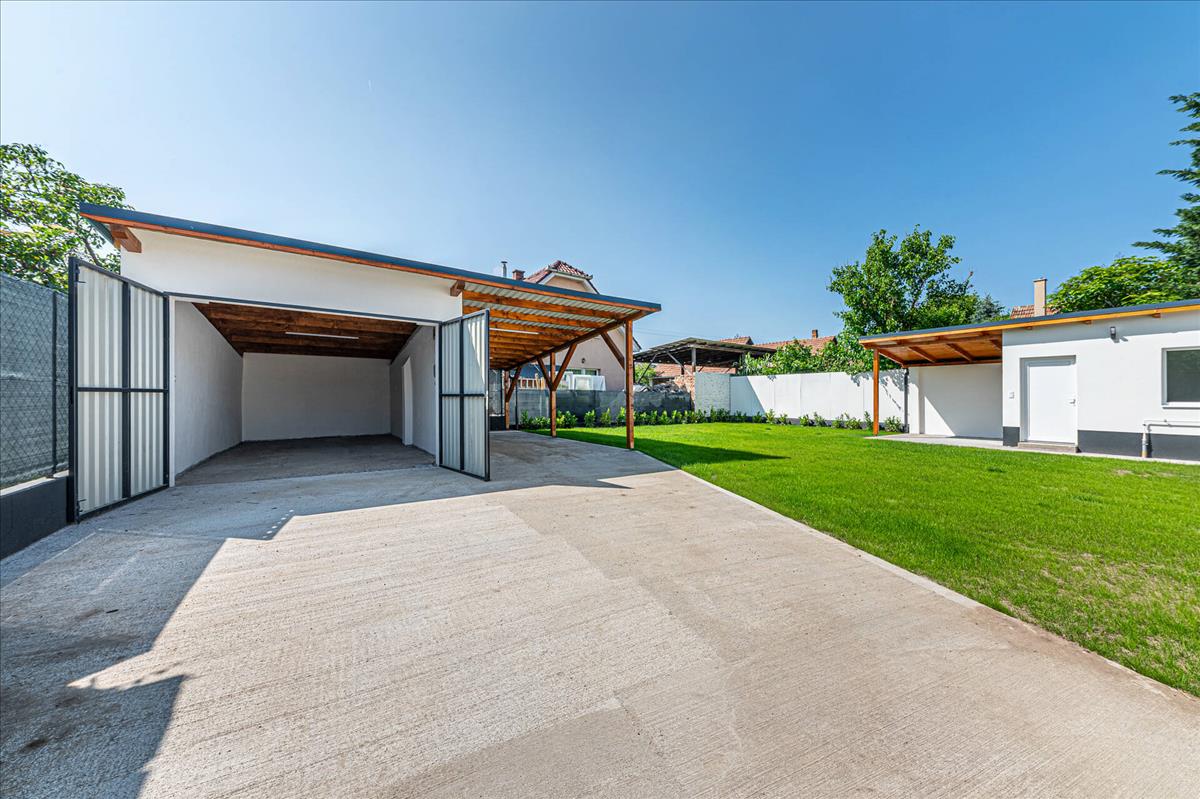 Az elektromos kapun keresztül két jármű számára van fedett beálló és garázs is.