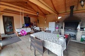 A nappaliból kilépve egy gyönyörű, hatalmas fedett teraszon találhatjuk magunkat, mely a nagy nyári melegben is kellemes hűs búvóhely lehet. Akár nagyobb társaságot is fogadhatunk és vendégül láthatjuk őket, hiszen épített grill és főzési lehetőség is rendelkezésre áll, vizesblokkal együtt.