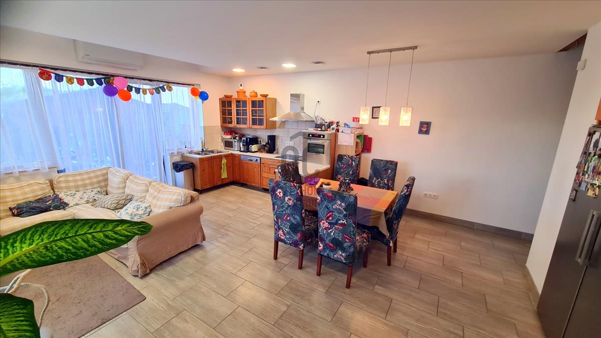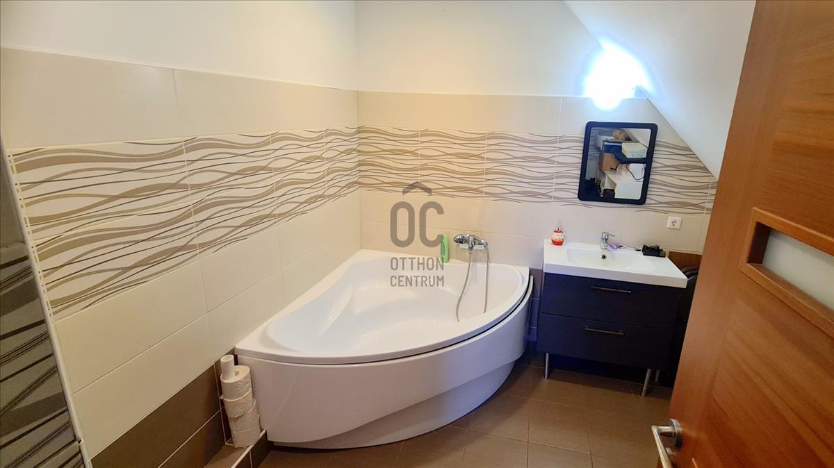 Fenti részen (177m2) három teljes értékű szoba (ebből az egyik saját fürdővel, WC-vel rendelkezik), egy fürdőszoba WC-vel, egy vendég wc, kamra és egy nagy légterű amerikai konyhás, nappalis helyiség.