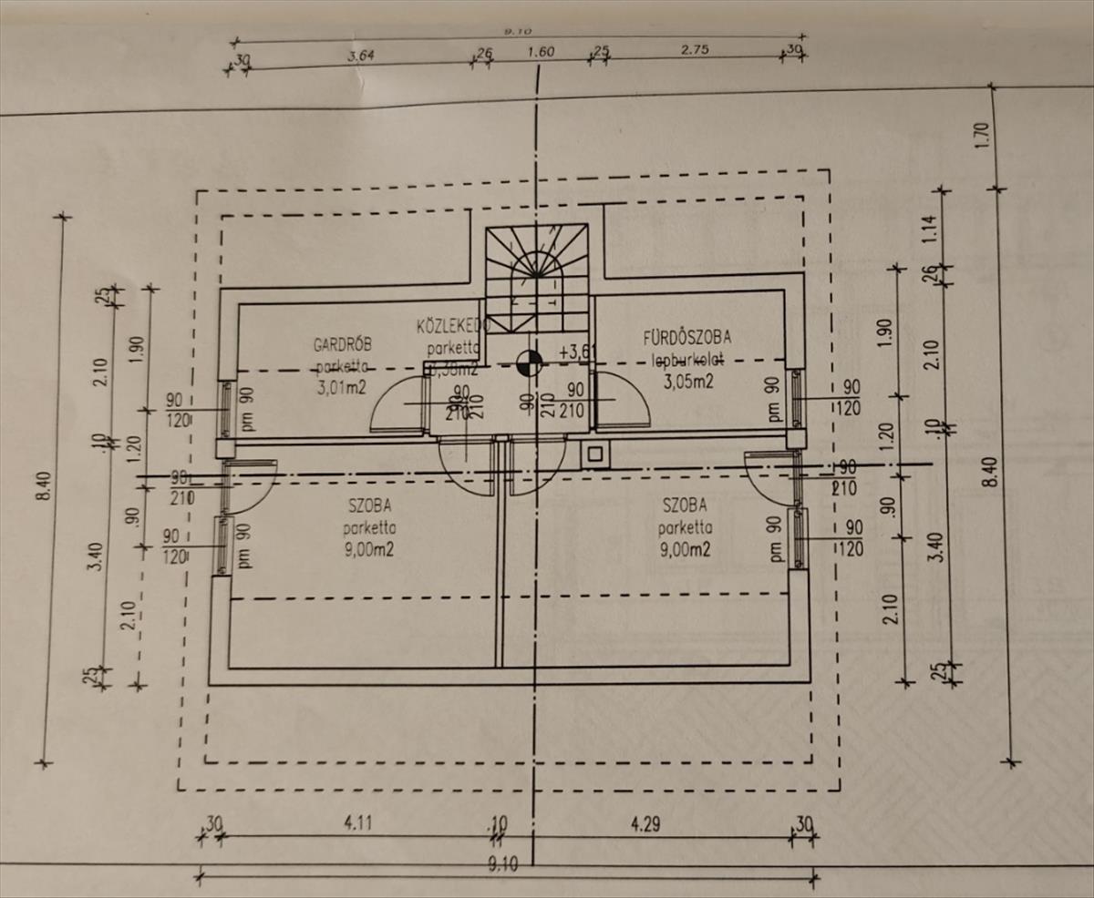 A tetőtérben egy közlekedőből nyíló három hálószoba, valamint egy fürdőszoba kapott helyet.