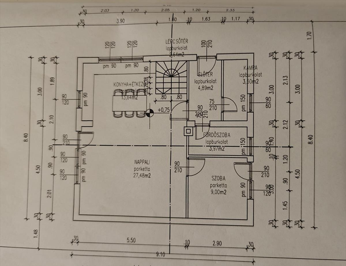A földszinten előszoba, tágas amerikai konyhás nappali, egy hálószoba, kamra, fürdőszoba és külön wc található.