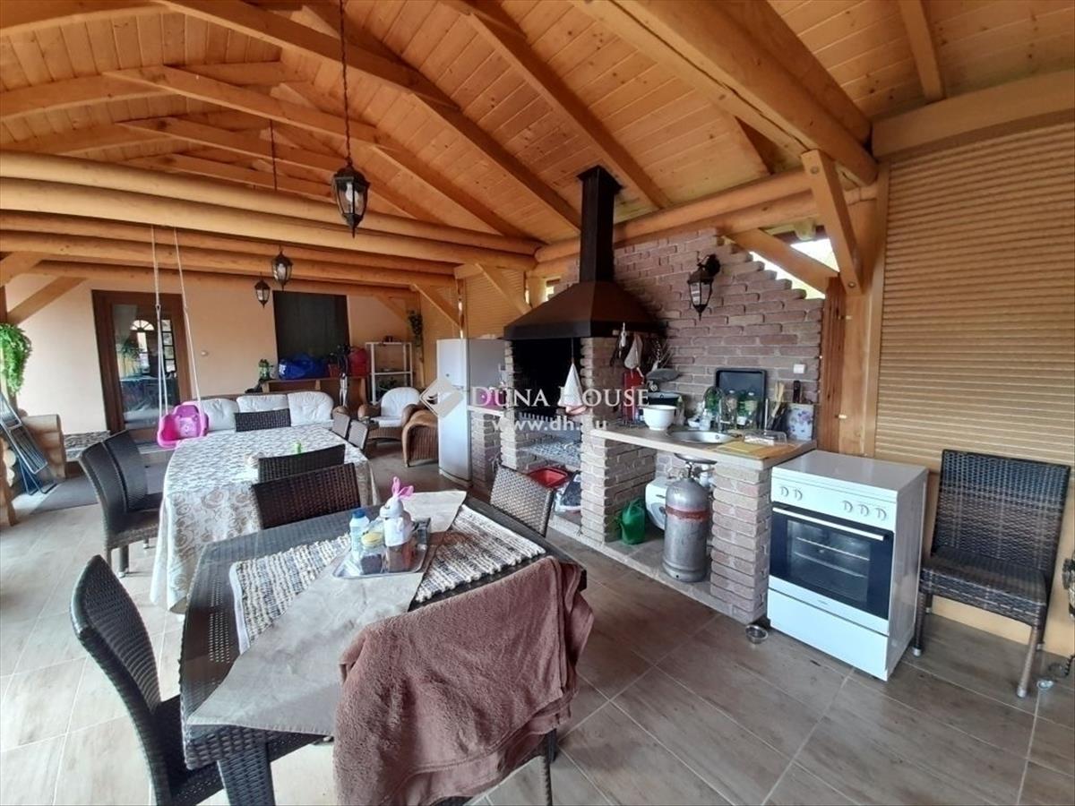 A nappaliból kilépve egy gyönyörű, hatalmas fedett teraszon találhatjuk magunkat, mely a nagy nyári melegben is kellemes hűs búvóhely lehet. Akár nagyobb társaságot is fogadhatunk és vendégül láthatjuk őket, hiszen épített grill és főzési lehetőség is rendelkezésre áll, vizesblokkal együtt.