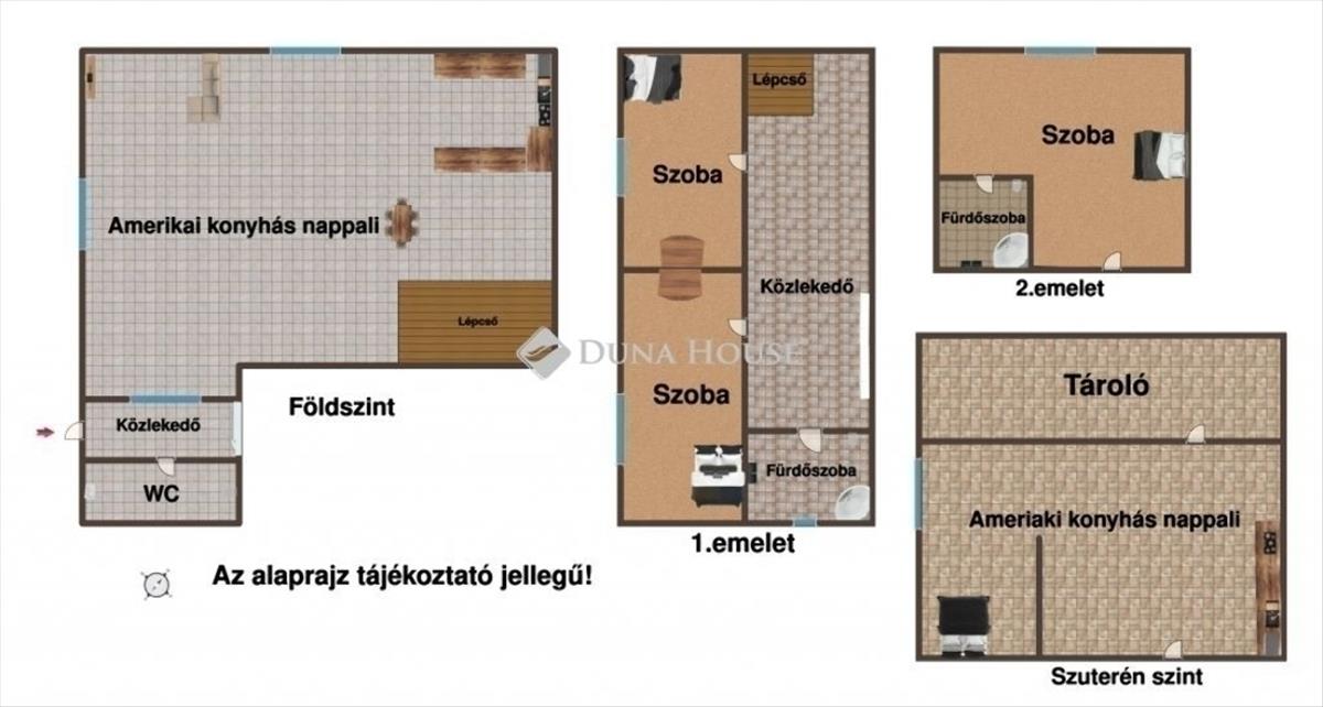 Az ingatlan összesen 168 m² (130 m² + 38 m² szuterén), 764 m² telken. a szuterénben nappali-konyha, 2 szoba és fürdő található, a földszinten 3 szoba (egy saját fürdővel), amerikai konyhás nappali, további 2 fürdő, vendég-WC és kamra.