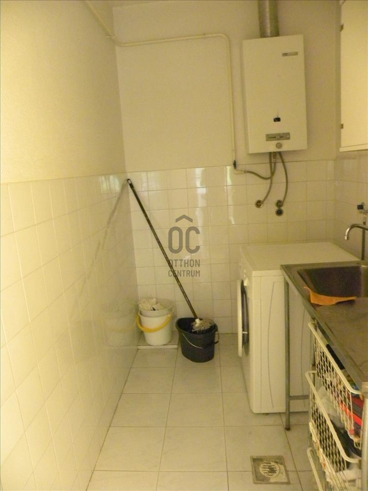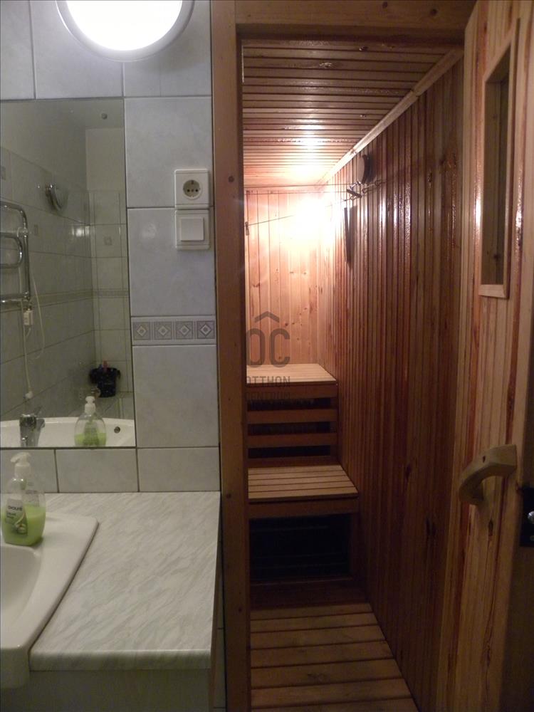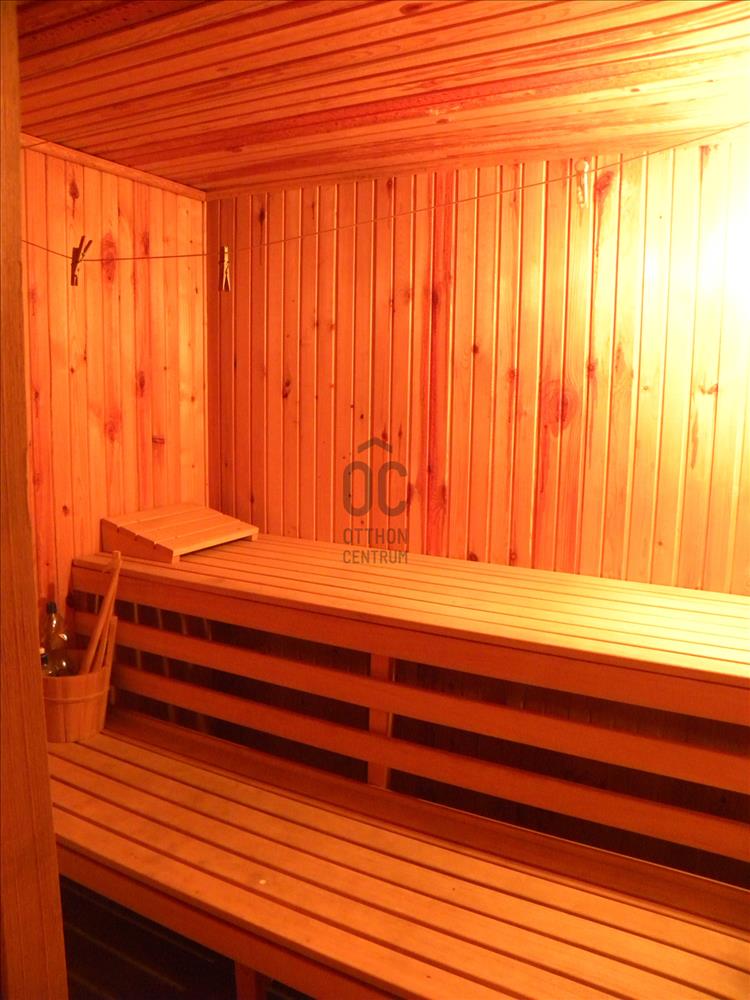 A fürdőszobából nyílik a szauna. a épület végén a szomszéd utcából nyílik a garázs, melyből az épületbe jutunk. (A telek szélessége, elhelyezkedése több kiadható garázs építésére ad lehetőséget)