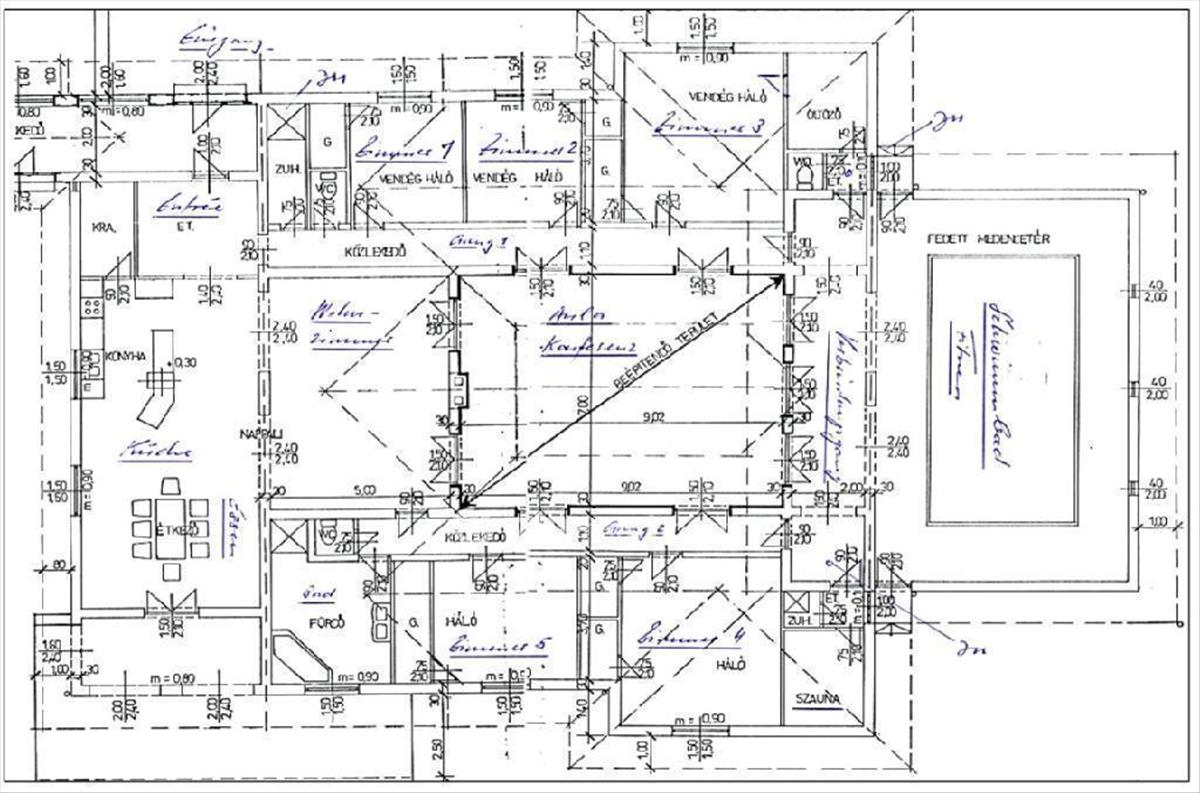 1. Egy földszintes, 560 nm -es házban egy tágas konyha-étkező (a nyári időszakban az étkezőből közvetlenül ki lehet ülni a nagy méretű teraszra, ha esetleg panzióként működne ez a több hálószobás épület, de privát családi vagy baráti összejövetelekhez is kiváló lehetőség), nappali szép kandallóval, 5 darab nagyon jó állapotú, hasonló méretű, bútorozott hálószoba és négy fürdőszoba (1 fürdőszoba/zuhanyzó/WC és 3 zuhanyzó/WC) is található, továbbá egy fedett edzőterem medencével és szaunával.