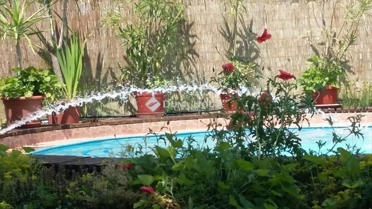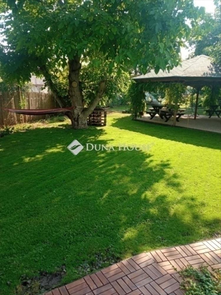 A hátsó terasz műfüves és faburkolattal készül, napernyővel és féltetővel védett bejárattal. a kertben egy 4, 6 m átmérőjű, földbe telepített medence rejtett gépészettel, kőkerttel díszítve, épített kemence, hűtő és folyóvíz szolgálja a kikapcsolódást. a kiülő 30 m²-es, oszlopaihoz lila akác van telepítve, akár 22 fő befogadására alkalmas. a hátsó kertben gyümölcsfák sora található, és további 125 m² termőterület kínál lehetőséget kertészkedésre. a melléképület 16 m² szigetelt tárolásra vagy egyéb célra alkalmas.